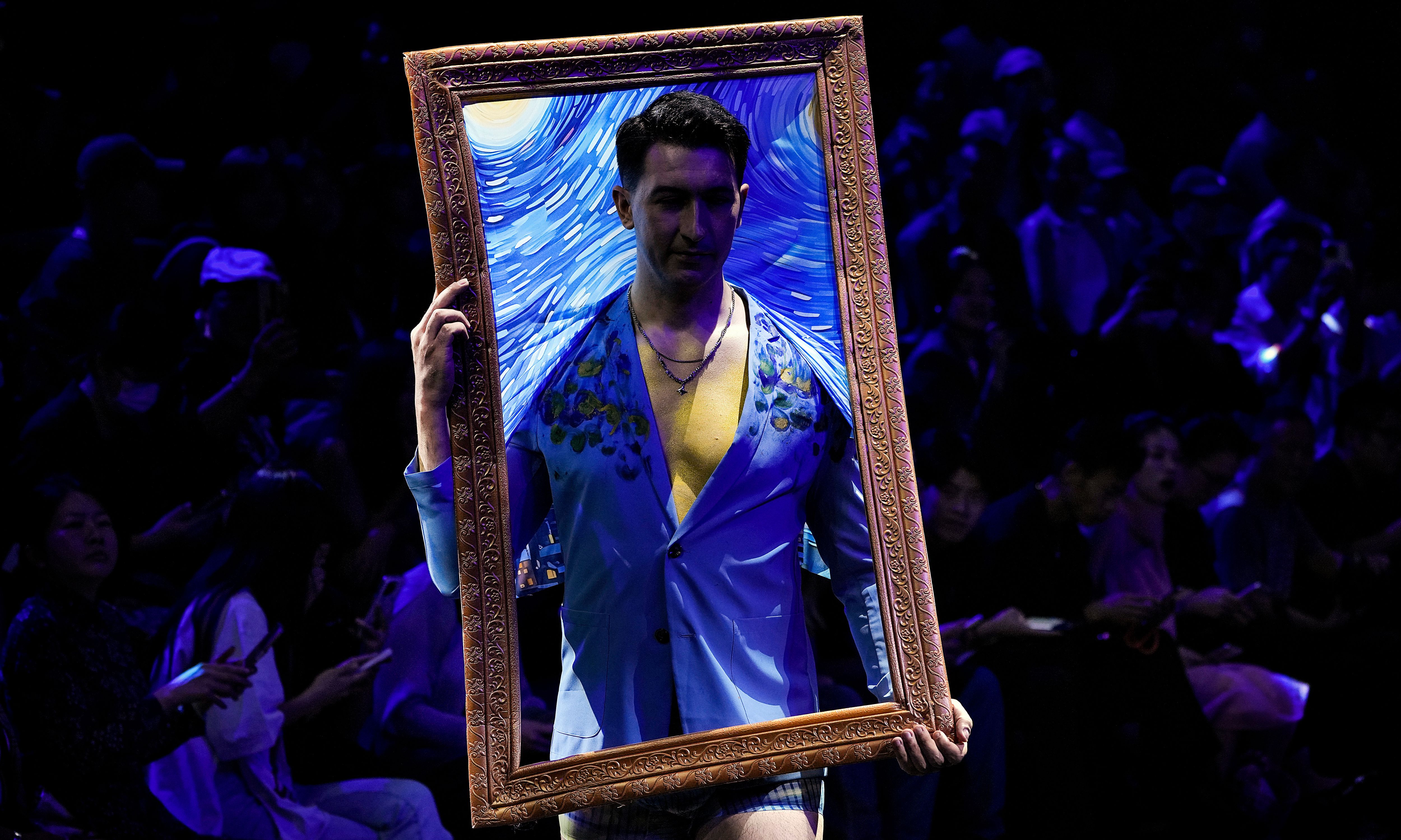 A model showcases a creation by Roma Century catwalks on stage during the SS25 China Fashion Week in Beijing, Tuesday, September 10, 2024. (Photo by Andy Wong/AP Photo)
