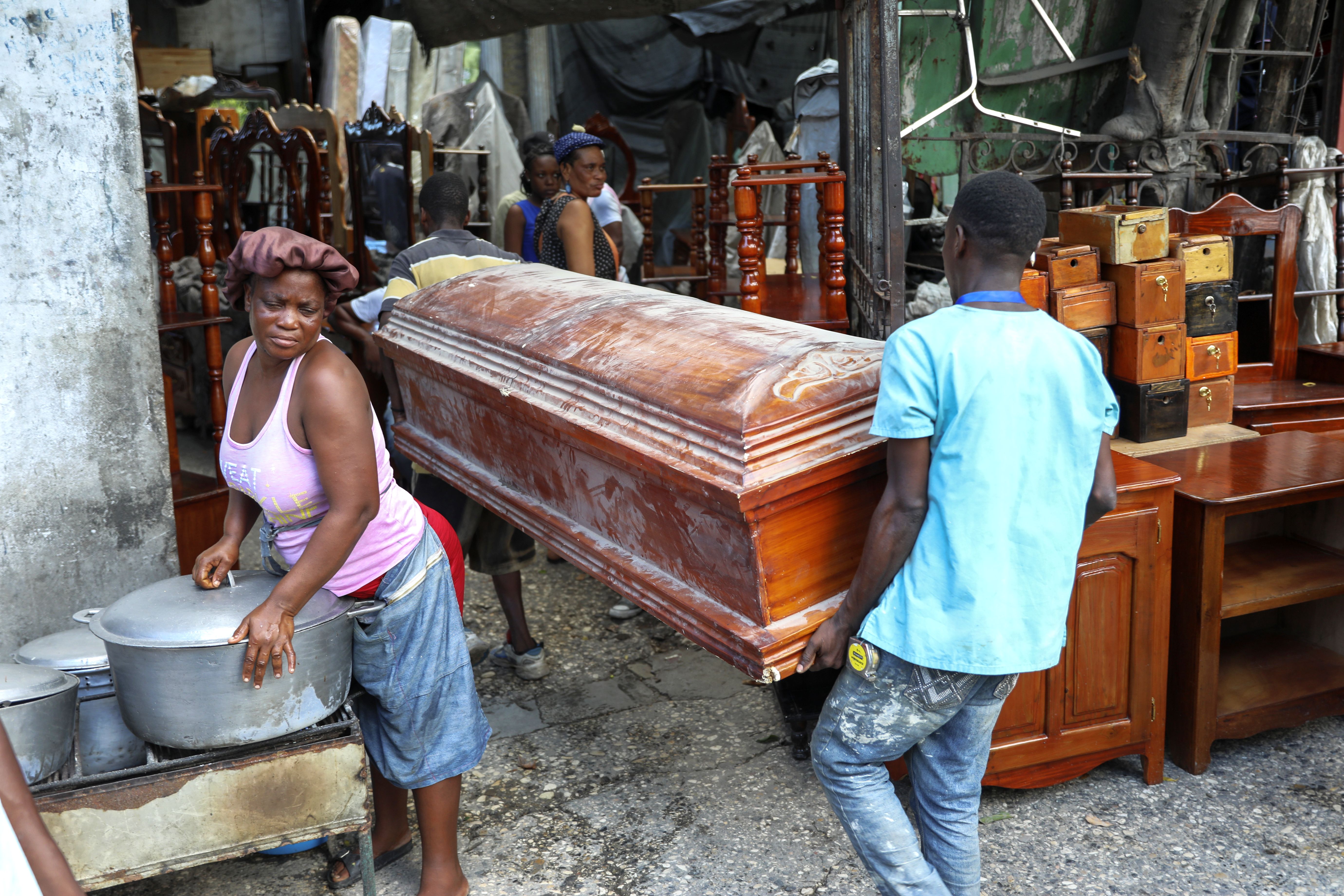 People carry an empty coffin past a street food vendor into the shop that is buying it to repair and sell in Port-au-Prince, Haiti, Friday, September 13, 2024. (Photo by Odelyn Joseph/AP Photo)