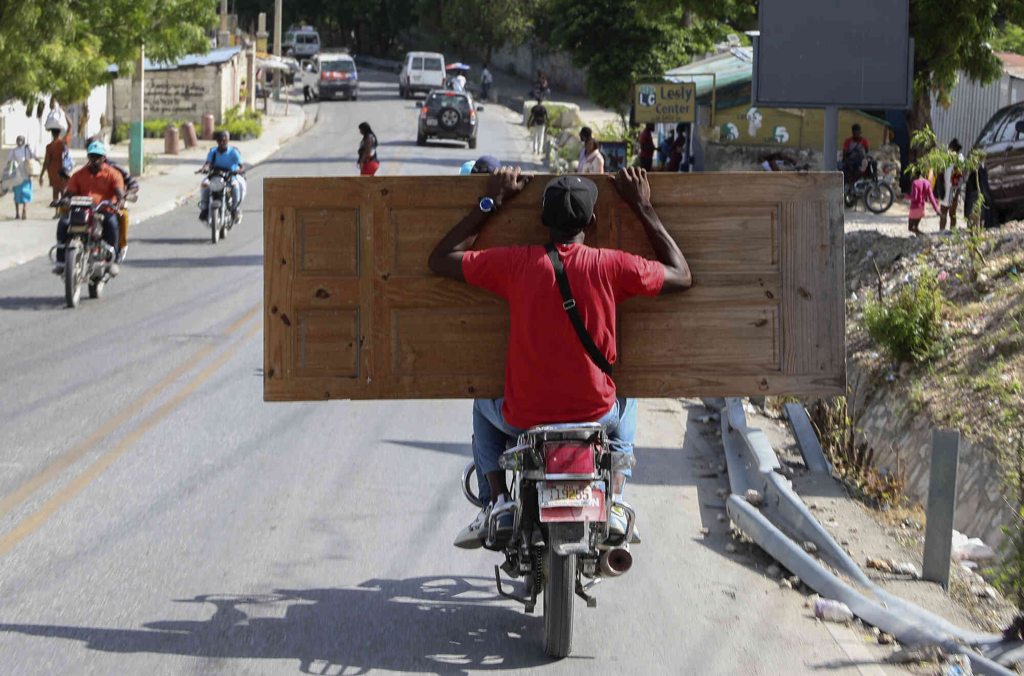 A man carries a wooden door on a motorcycle in Port-au-Prince, Haiti, Thursday, August 8, 2024. (Photo by Odelyn Joseph/AP Photo)