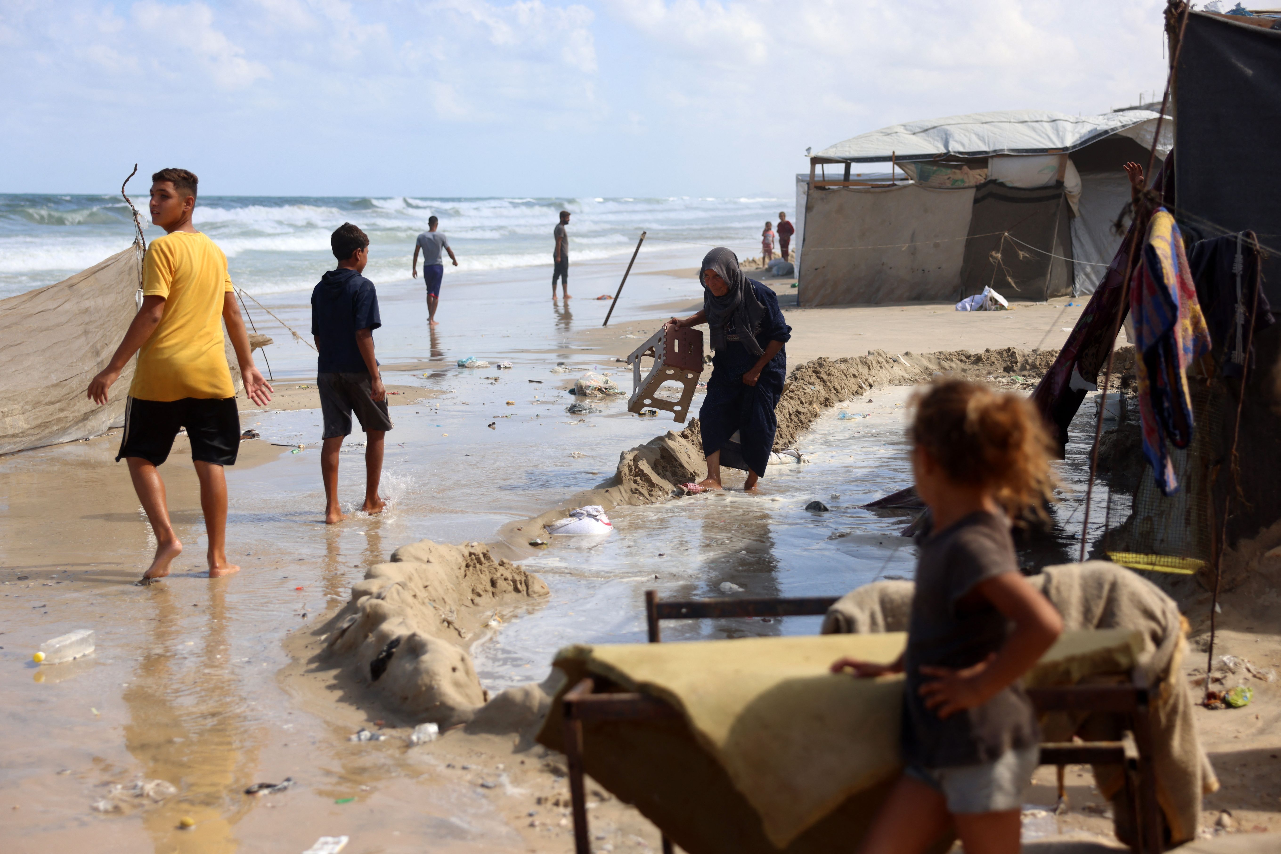 Displaced Palestinians gather near tents that were flooded with sea water because of the high tide combined with windy weather, along the shore of Khan Yunis in the southern Gaza Strip on September 15, 2024, amid the ongoing war between Israel and the Hamas militant group. (Photo by Bashar Taleb/AFP Photo)