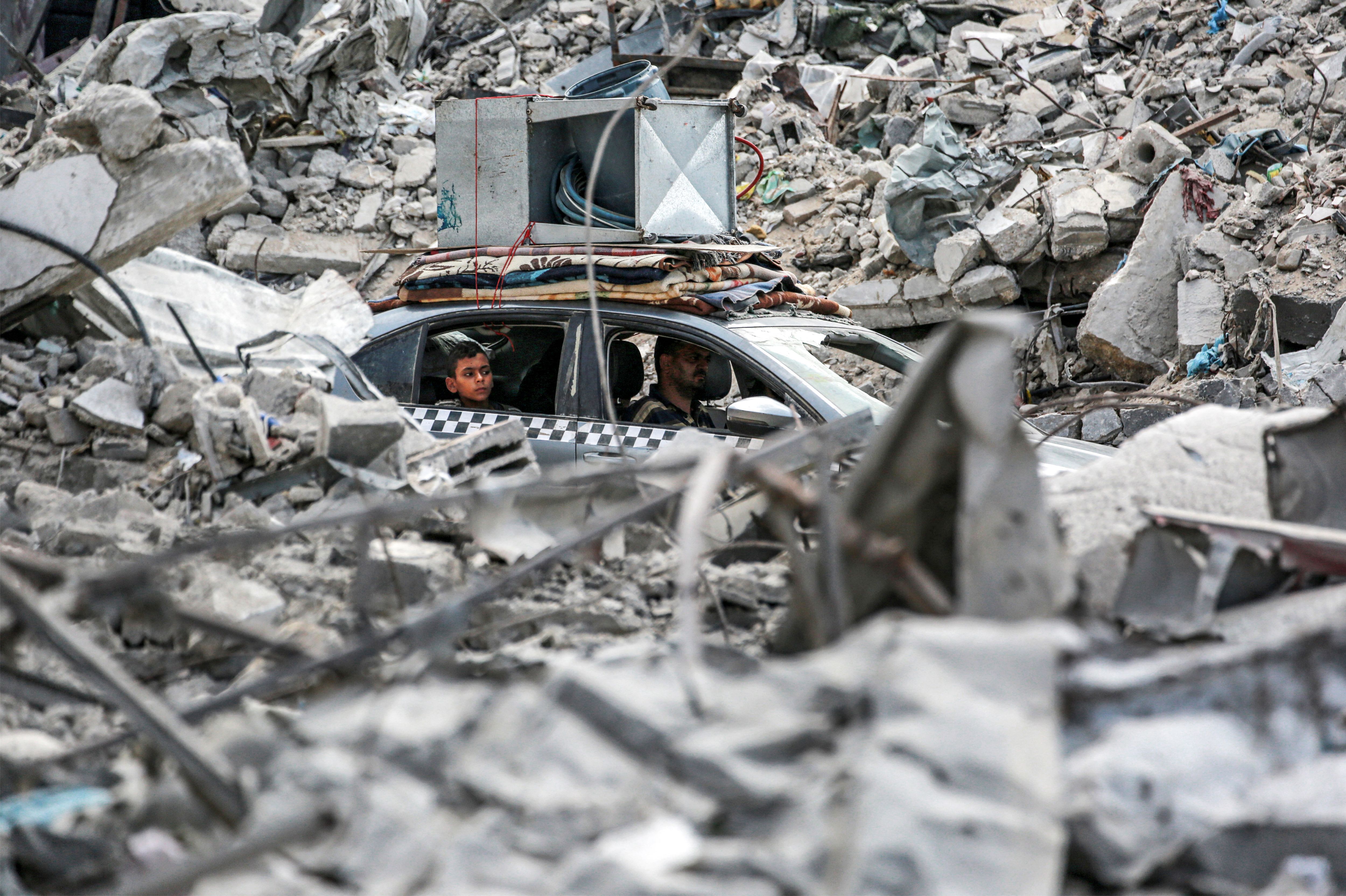 A vehicle moves past the rubble of collapsed buildings in Khan Yunis in the southern Gaza Strip on September 16, 2024, amid the ongoing war in the Palestinian territory between Israel and Hamas. (Photo by Bashar Taleb/AFP Photo)