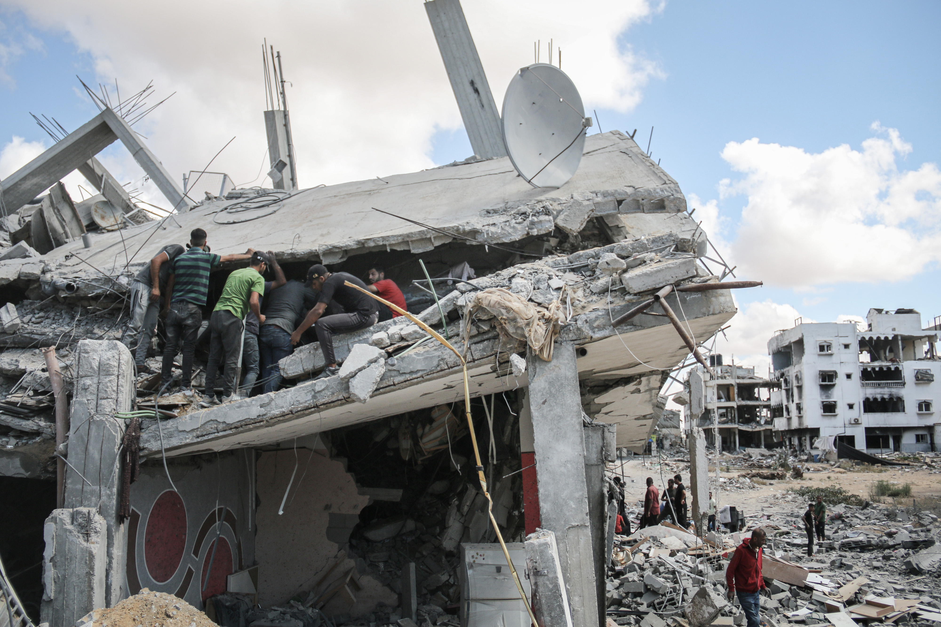 Palestinians search a collapsed building following an Israeli strike in the east of the refugee camp in al-Bureij, central Gaza, on Wednesday, September 18, 2024. The US Secretary of State is in Egypt Sept. 17-19 to meet with Egyptian officials to discuss ongoing efforts to reach a cease-fire in Gaza, according to a State Department statement. (Photo by Ahmad Salem/Bloomberg)
