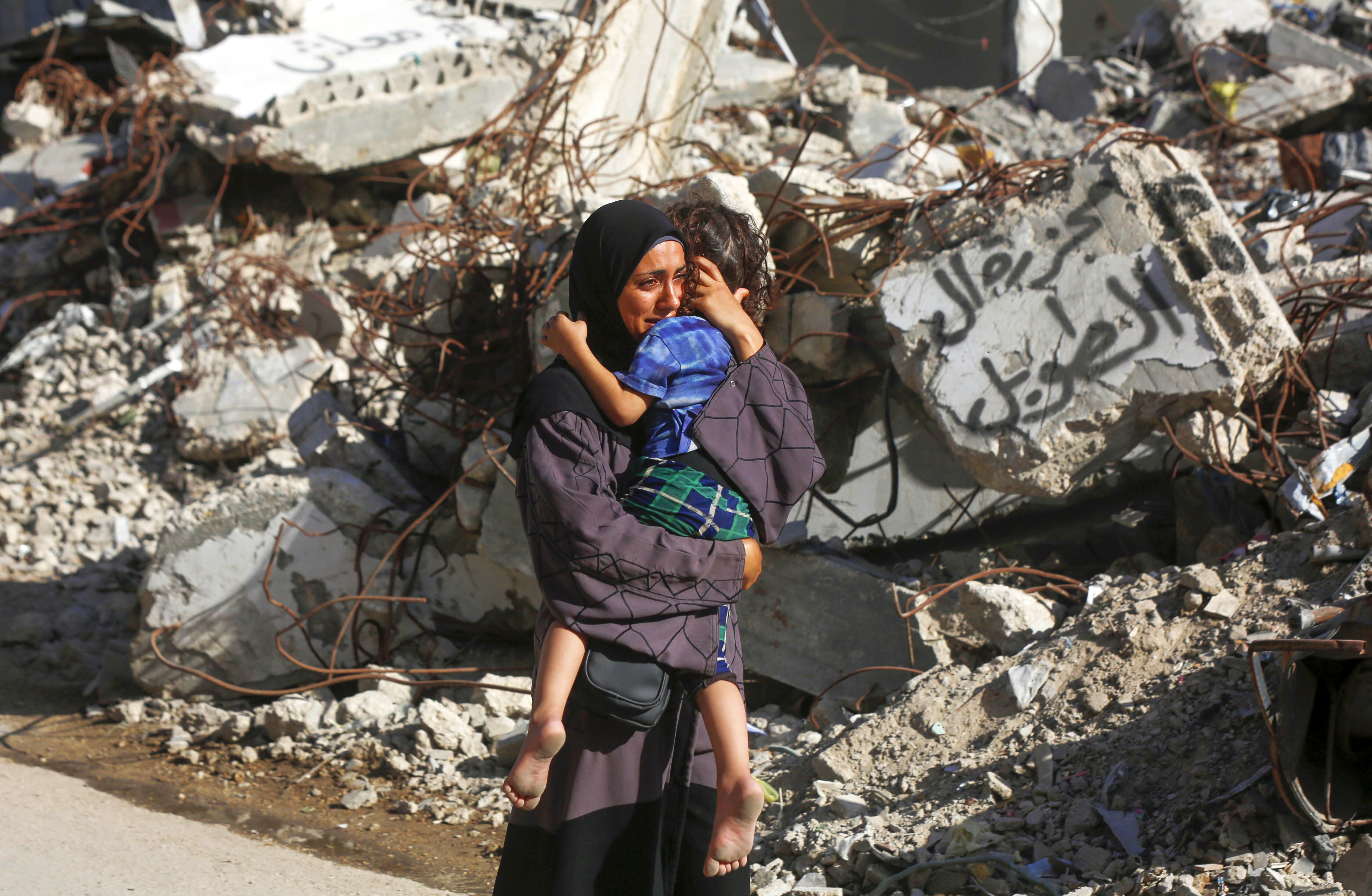 A Palestinian woman carrying her child in her arms cries in front of a collapsed building as the dead bodies of Palestinians who died in Israel's attack on the Bureij Refugee Camp brought to the al-Awda Hospital for burial in Gaza City, Gaza on September 19, 2024. It was reported that there were dead and injured people as a result of the attack carried out by the Israeli army. (Photo by Ashraf Amra/Anadolu via Getty Images)