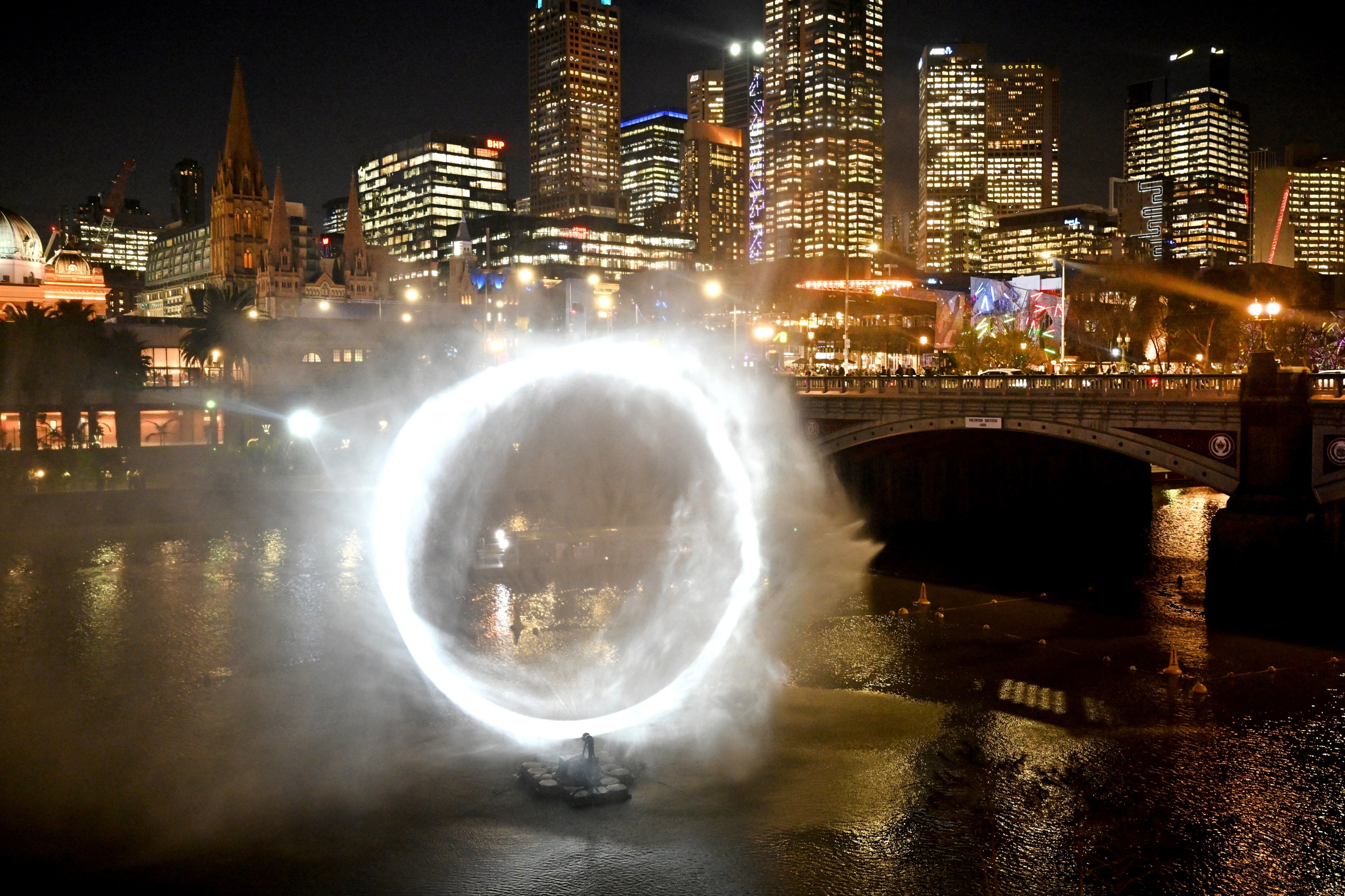A light display titled “Constellation” by Studio Lemercier, where light is projected on invisible water particles to form shapes and intangible structures in the air resulting in 3D-like visuals, is viewed on Melbourne's Yarra River on August 29, 2024. (Photo by William West/AFP Photo)