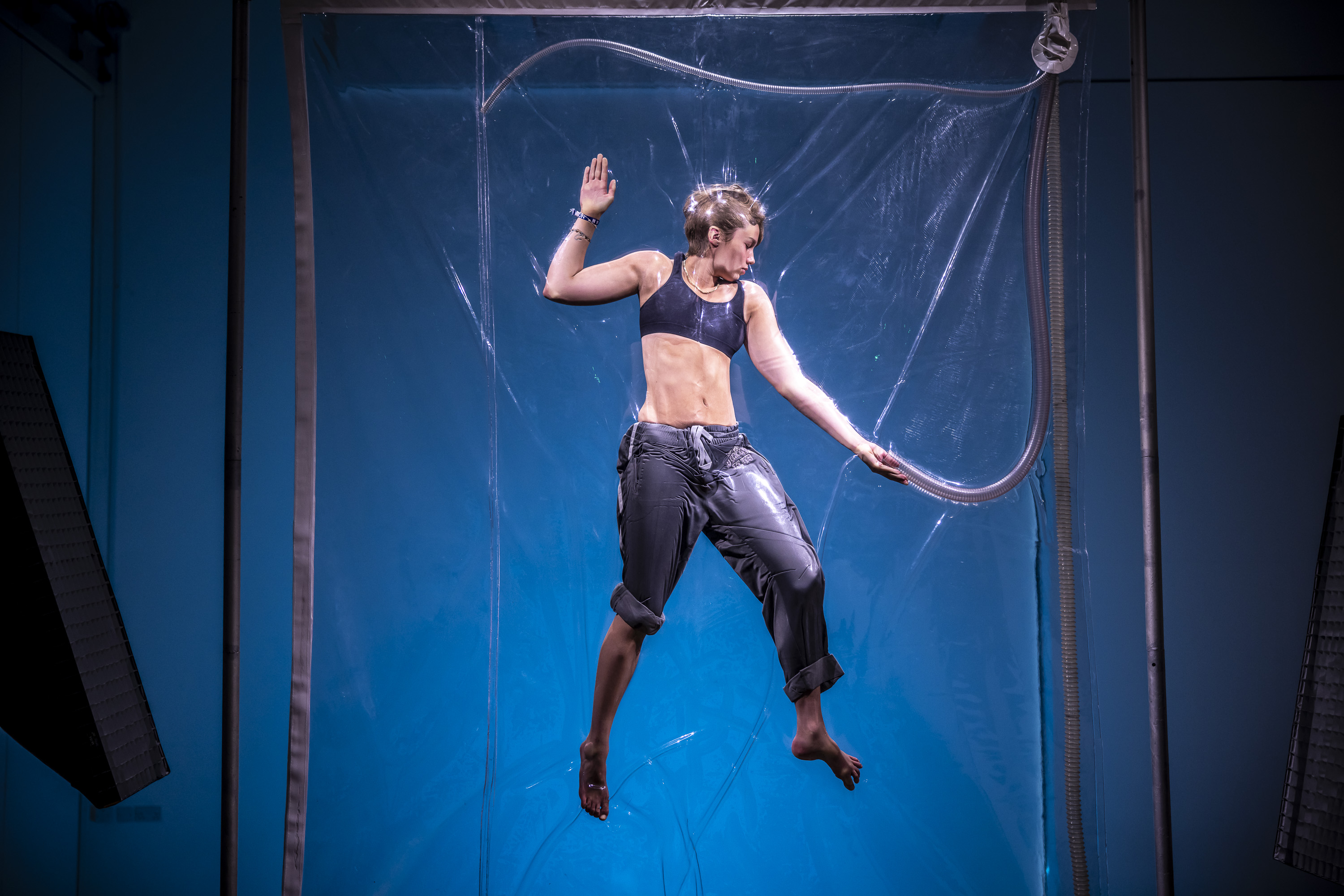 Isadora Falstaff, 17, is vacuum-packed and vertically suspended between two transparent plastic sheets as a part of Shrink 01995, a performance artwork by Lawrence Malstaf on display at the Great North Museum in Newcastle, UK on August 8, 2024. (Photo by James Gloss/The Times)