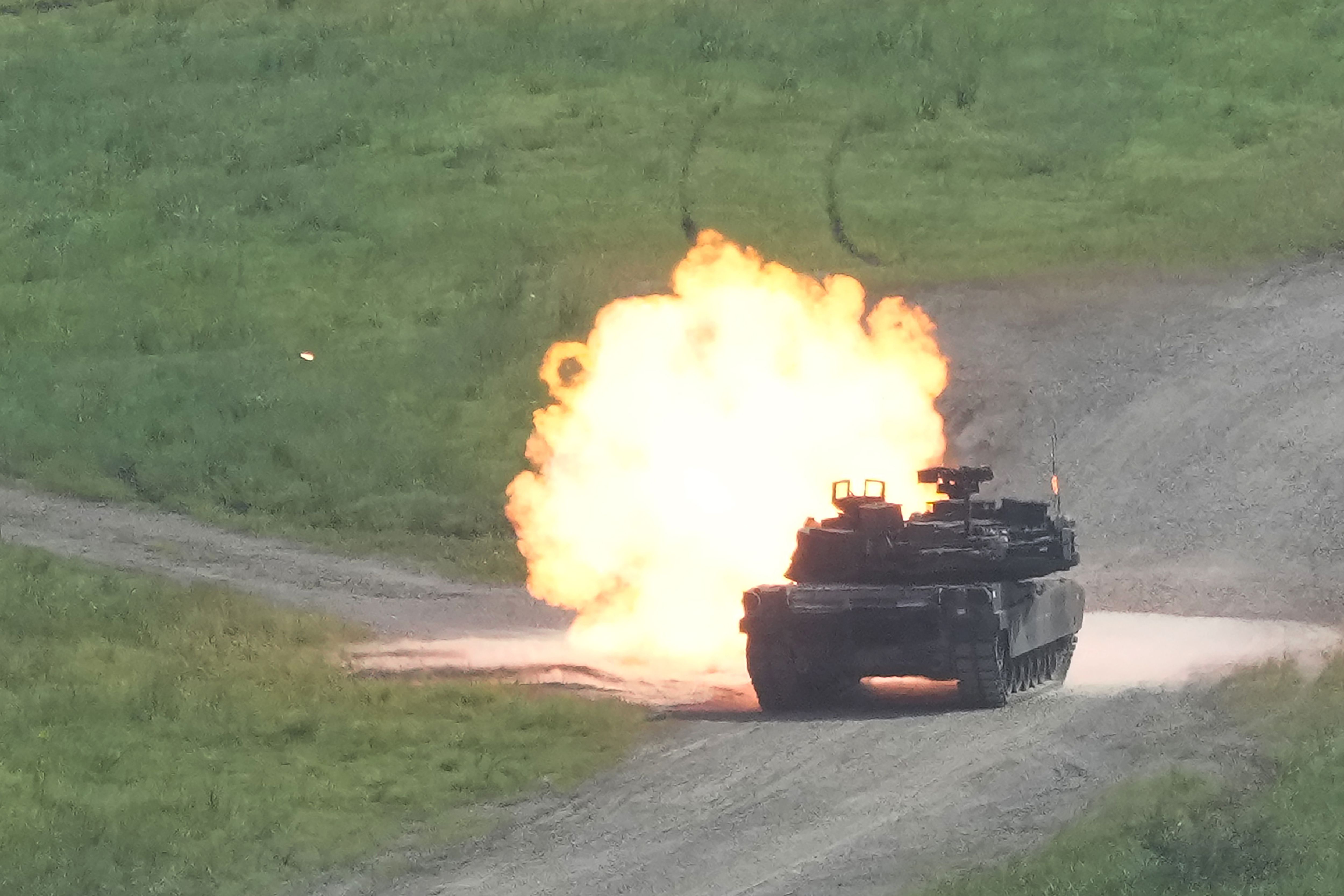 A U.S. Army's M1A2 Abrams tank from the 1st Armored Brigade Combat Team fires during a live firing drill at Rodriguez Live Fire Complex in Pocheon, South Korea, Wednesday, August 14, 2024. (Photo by Ahn Young-joon/AP Photo)