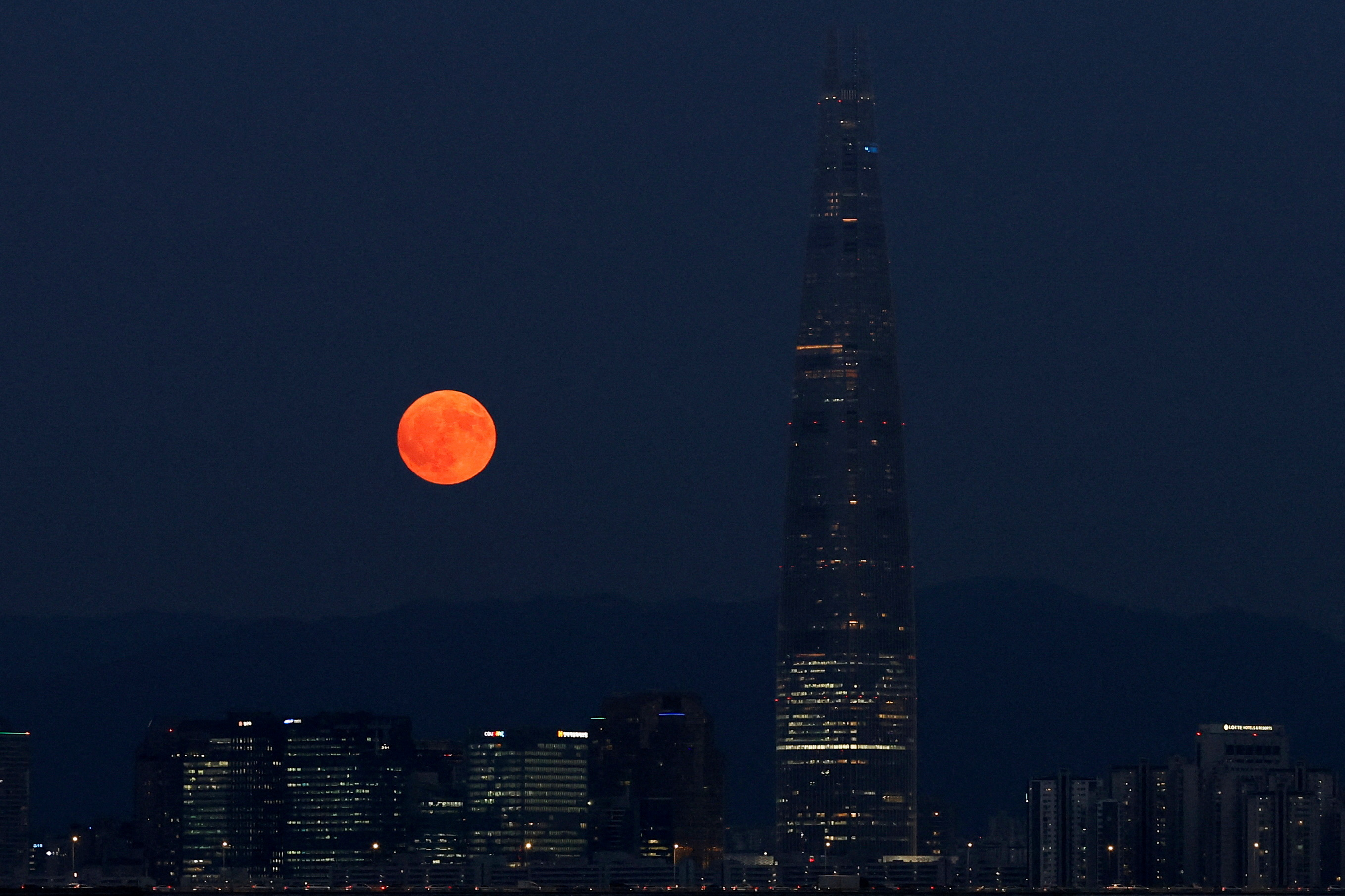 A Supermoon rises next to the 123-story Lotte World Tower in Seoul, South Korea on August 19, 2024. (Photo by Kim Soo-hyeon/Reuters)