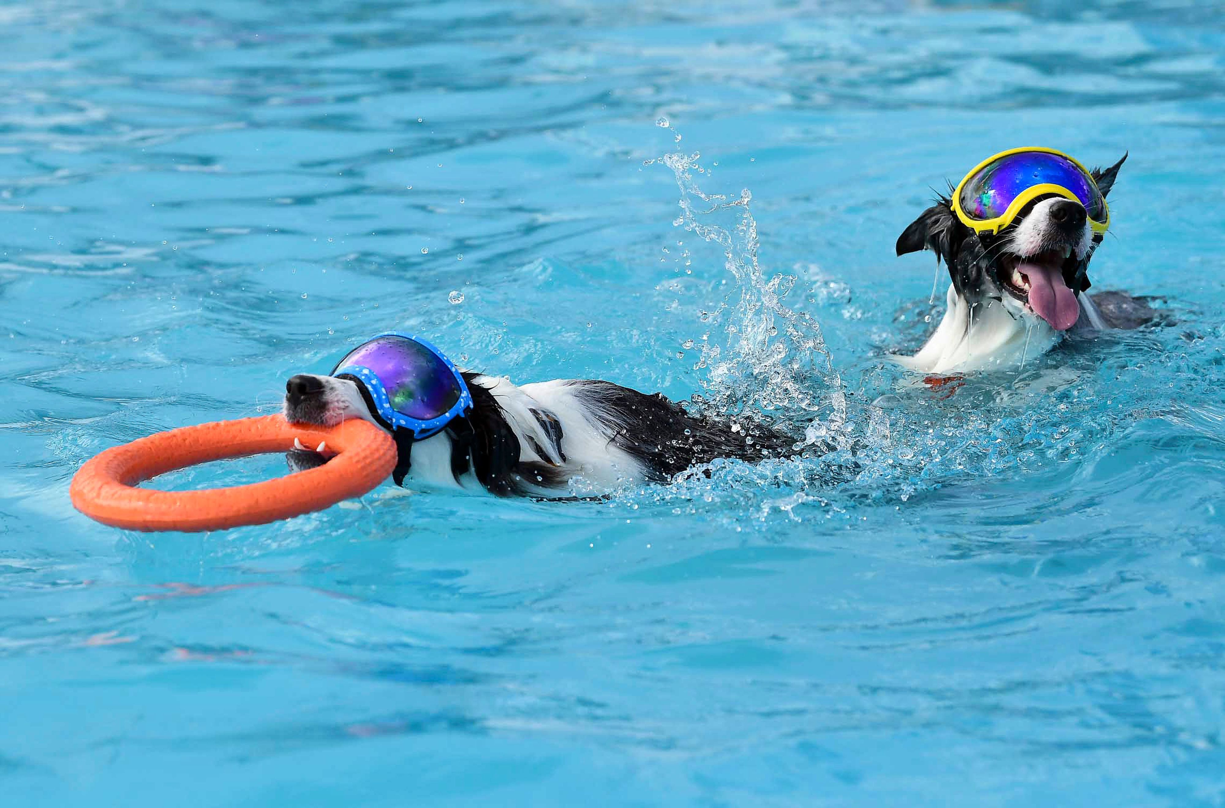 Dogs swim in a makeshift swimming pool in Seoul, South Korea, August 18, 2024. An event for dogs and dog owners to cool off amid the heat wave is held at a swimming pool in Seoul. (Photo by Xinhua News Agency/Rex Features/Shutterstock)