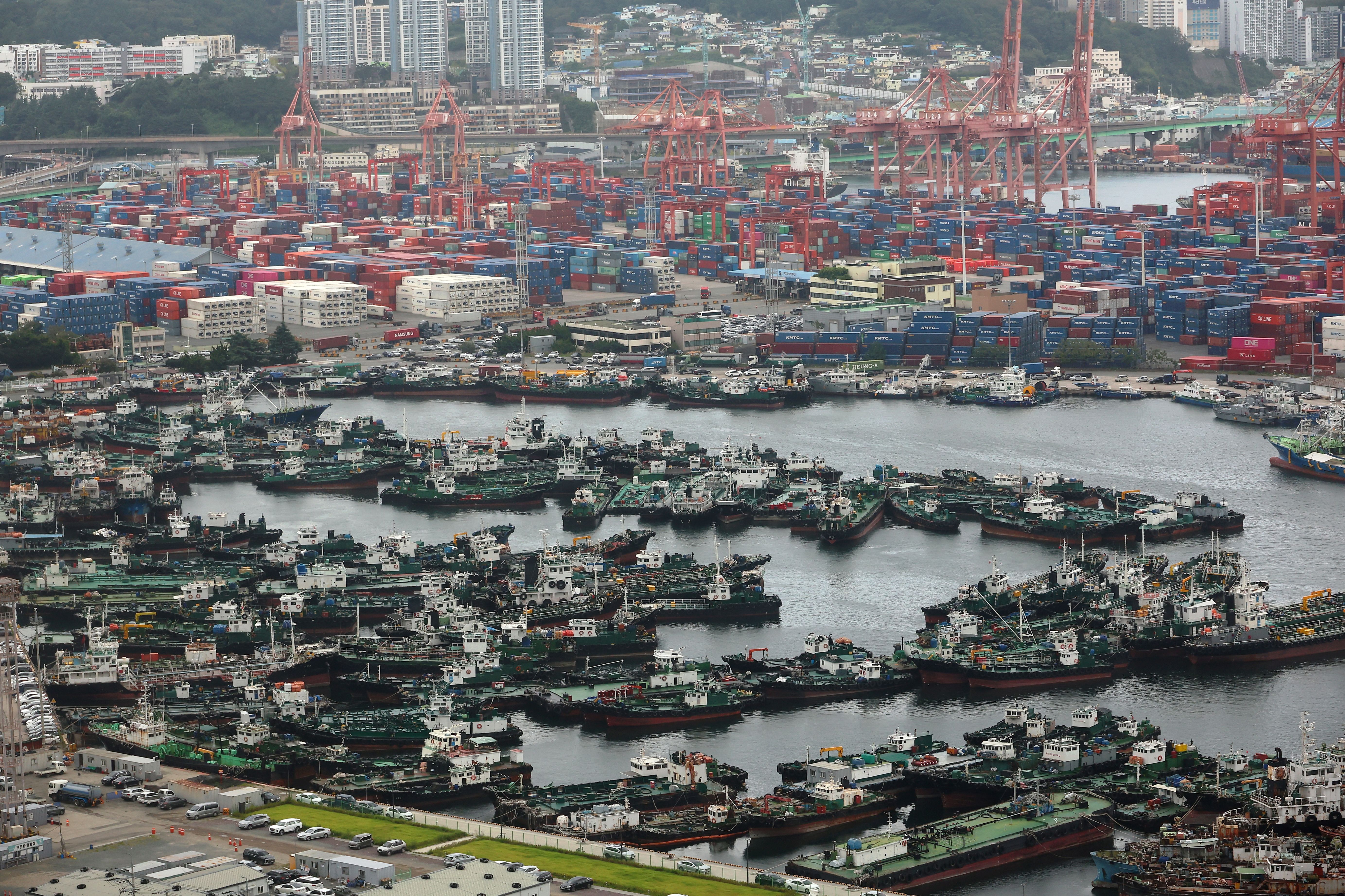 Ships take shelter at a port in Busan, South Korea, 28 August 2024, as Typhoon Shanshan moves northwest toward Japan. (Photo by Yonhap/EPA)