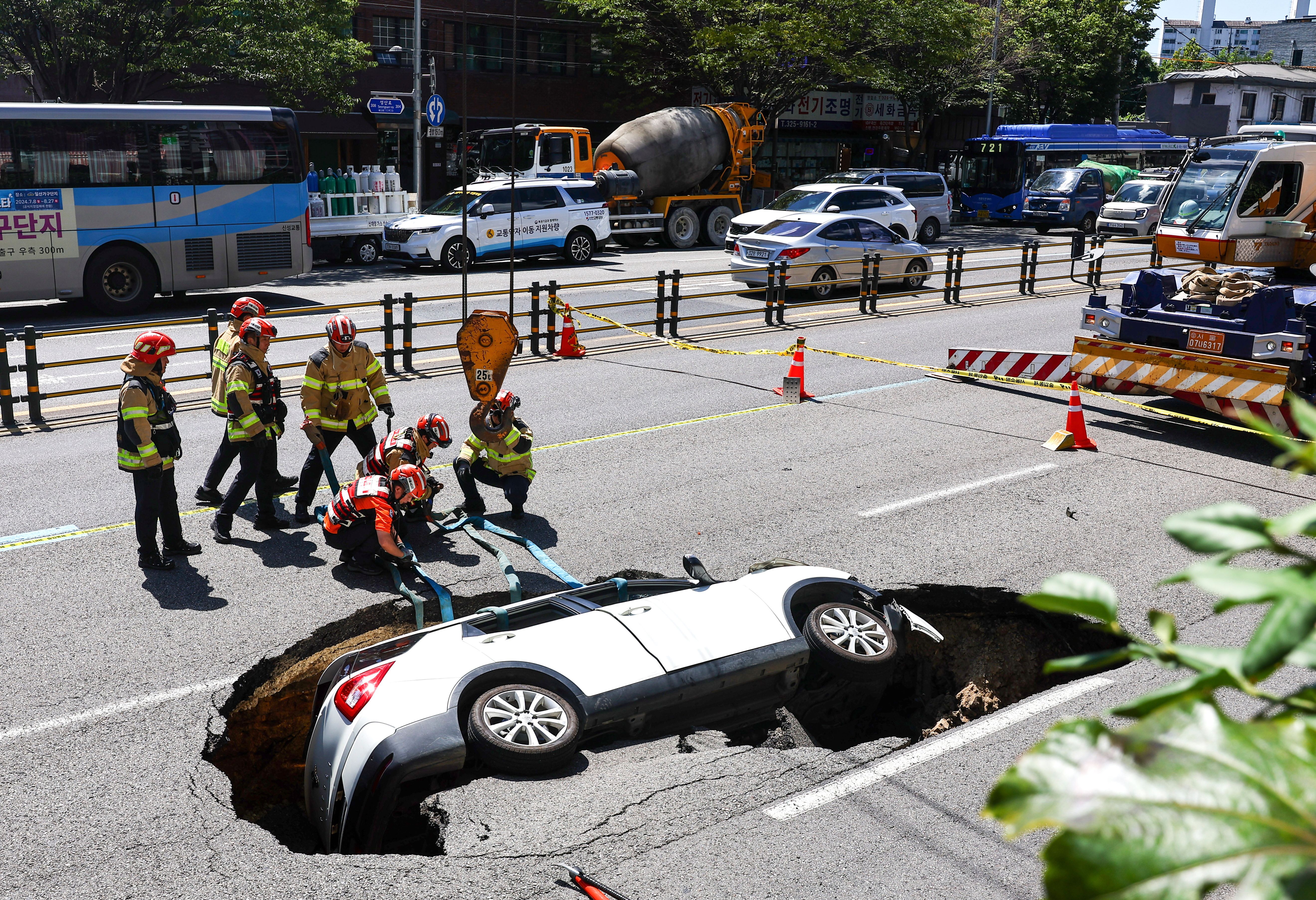 Firefighters prepare to remove a car from a sinkhole that emerged in the middle of a road in Seoul, South Korea, 29 August 2024. According to fire authorities, two people were injured after a car plunged into the sinkhole. (Photo by Yonhap/EPA/EFE)