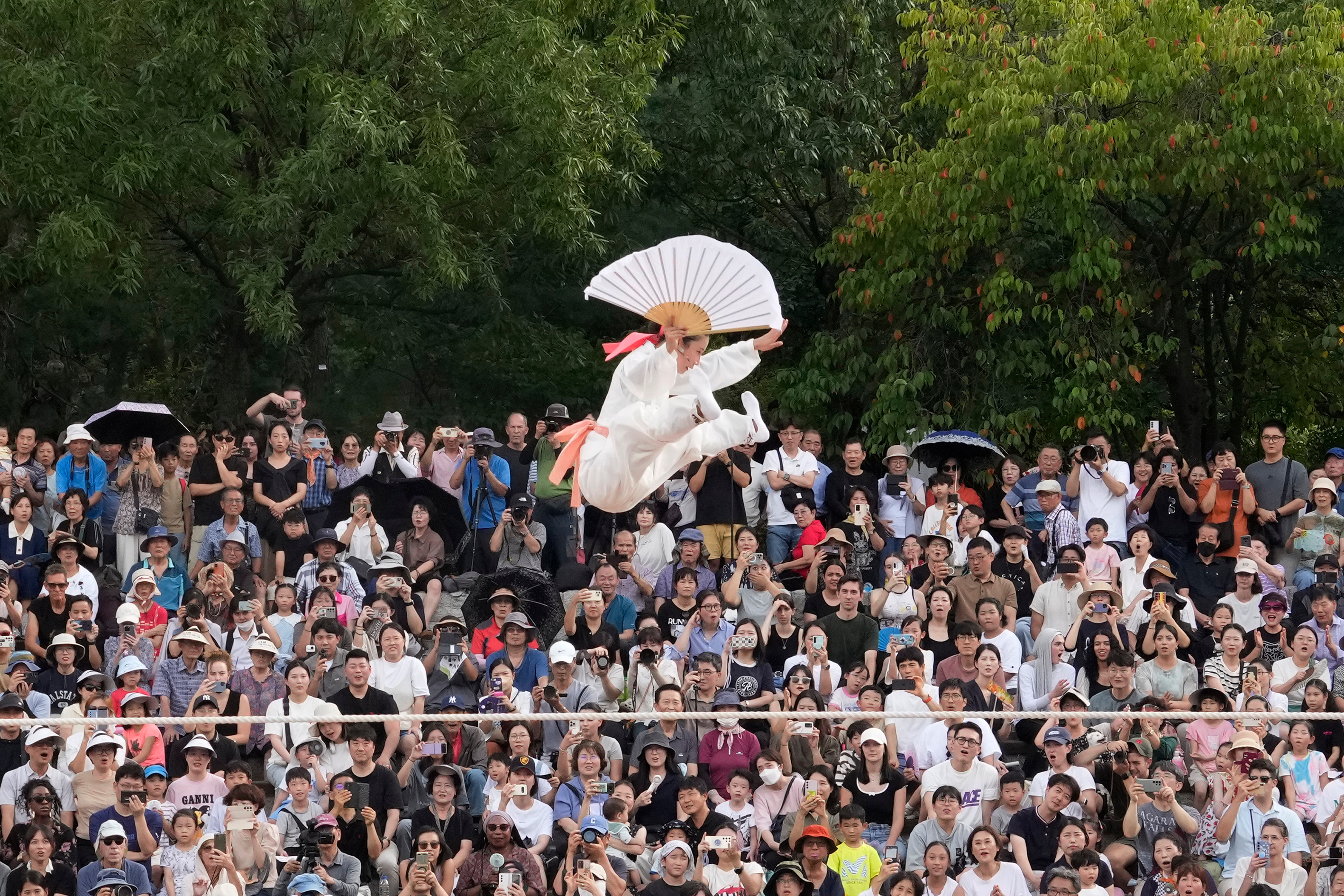 South Korean tightrope walker Seo Joo Hyang performs “Jultagi”, or Tightrope Walking, to celebrate the Chuseok, the Korean version of Thanksgiving Day, at the Namsan Hanok village in Seoul, South Korea, Tuesday, September 17, 2024. (Photo by Ahn Young-joon/AP Photo)