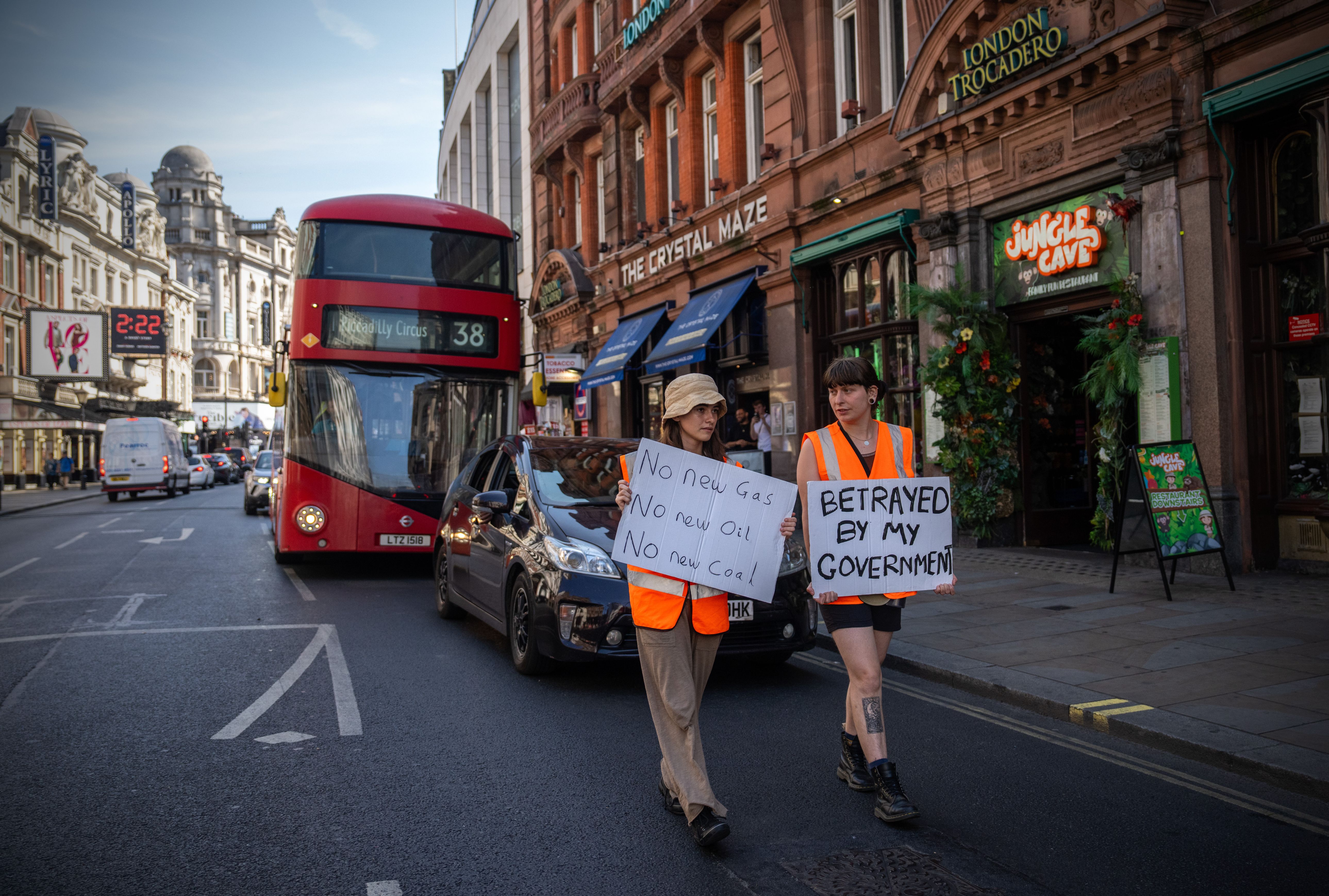 Just Stop Oil protesters slow-walk along Shaftesbury Avenue on June 15, 2023 in London, England. Protest group Just Stop Oil is campaigning to persuade the British government to commit to halting new fossil fuel licensing and production by holding Go Slow Walking protests in major cities across the UK. The Government is introducing new legislation by the end of June that will allow the police to intervene to prevent this form of protest. (Photo by Carl Court/Getty Images)
