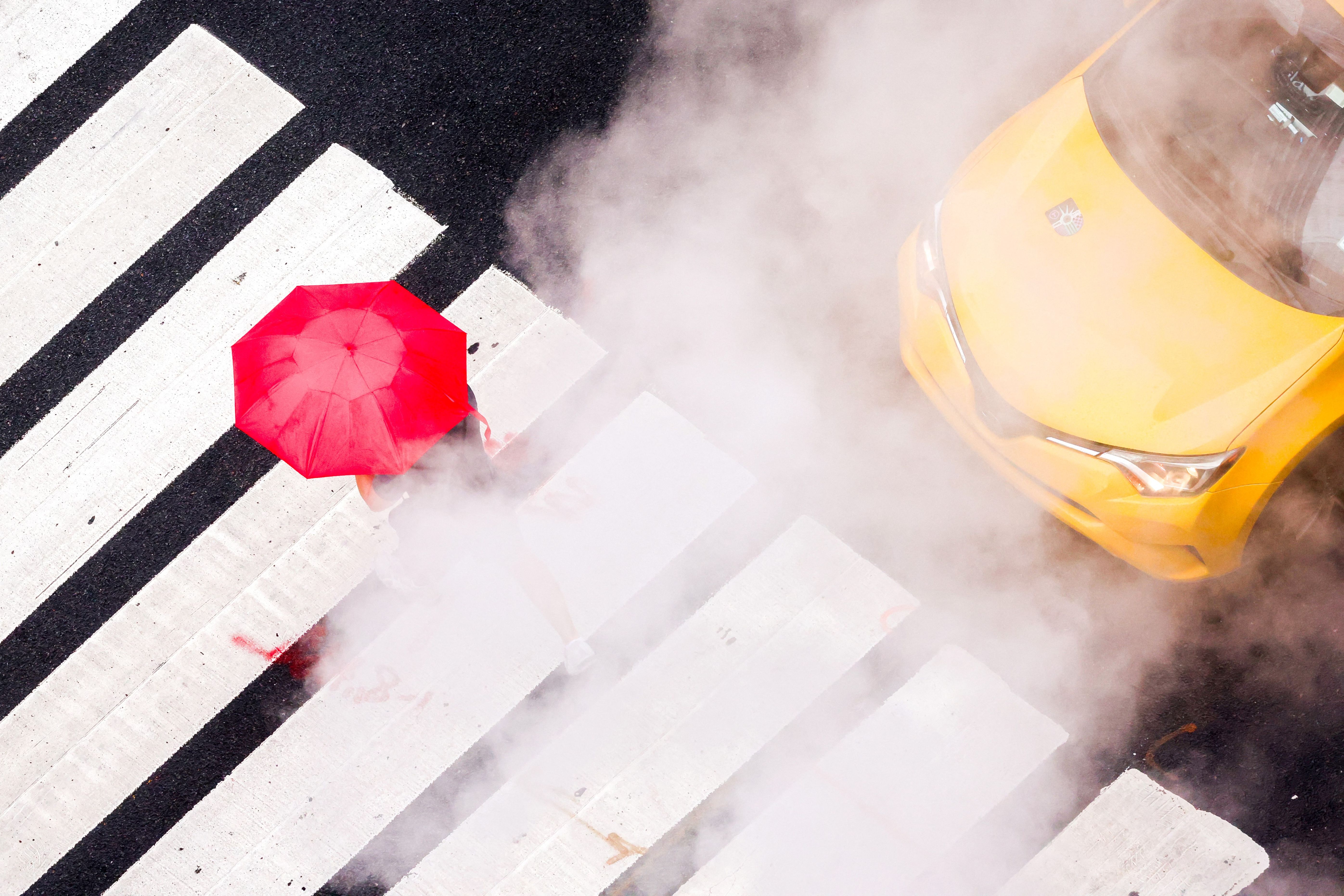A person crosses Third Avenue during a rainy day in New York on August 8, 2024. (Photo by Charly Triballeau/AFP Photo)