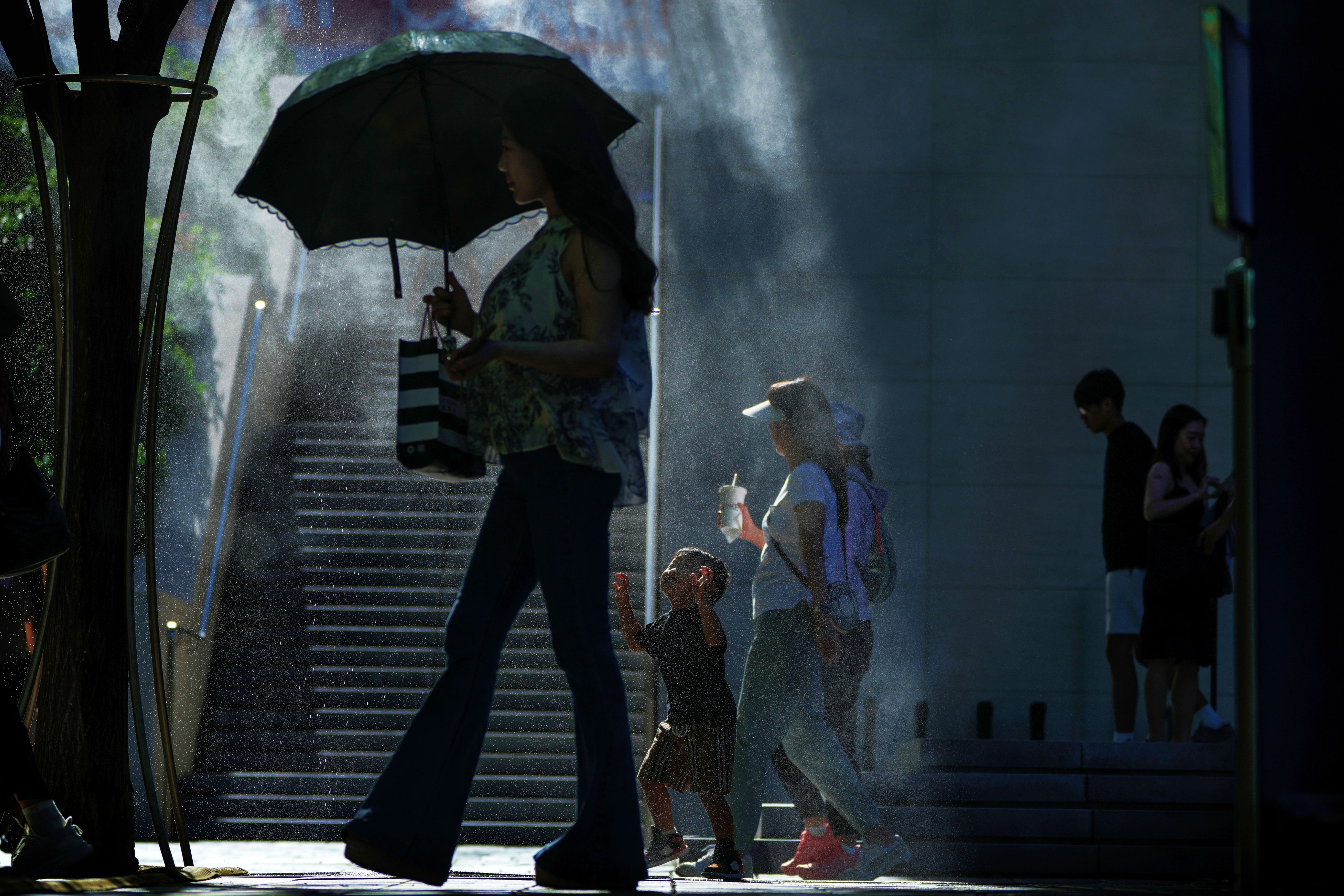 Shoppers walk by as a child plays near a mist machine at an outdoor shopping mall in Beijing, Monday, August 12, 2024. (Photo by Andy Wong/AP Photo)