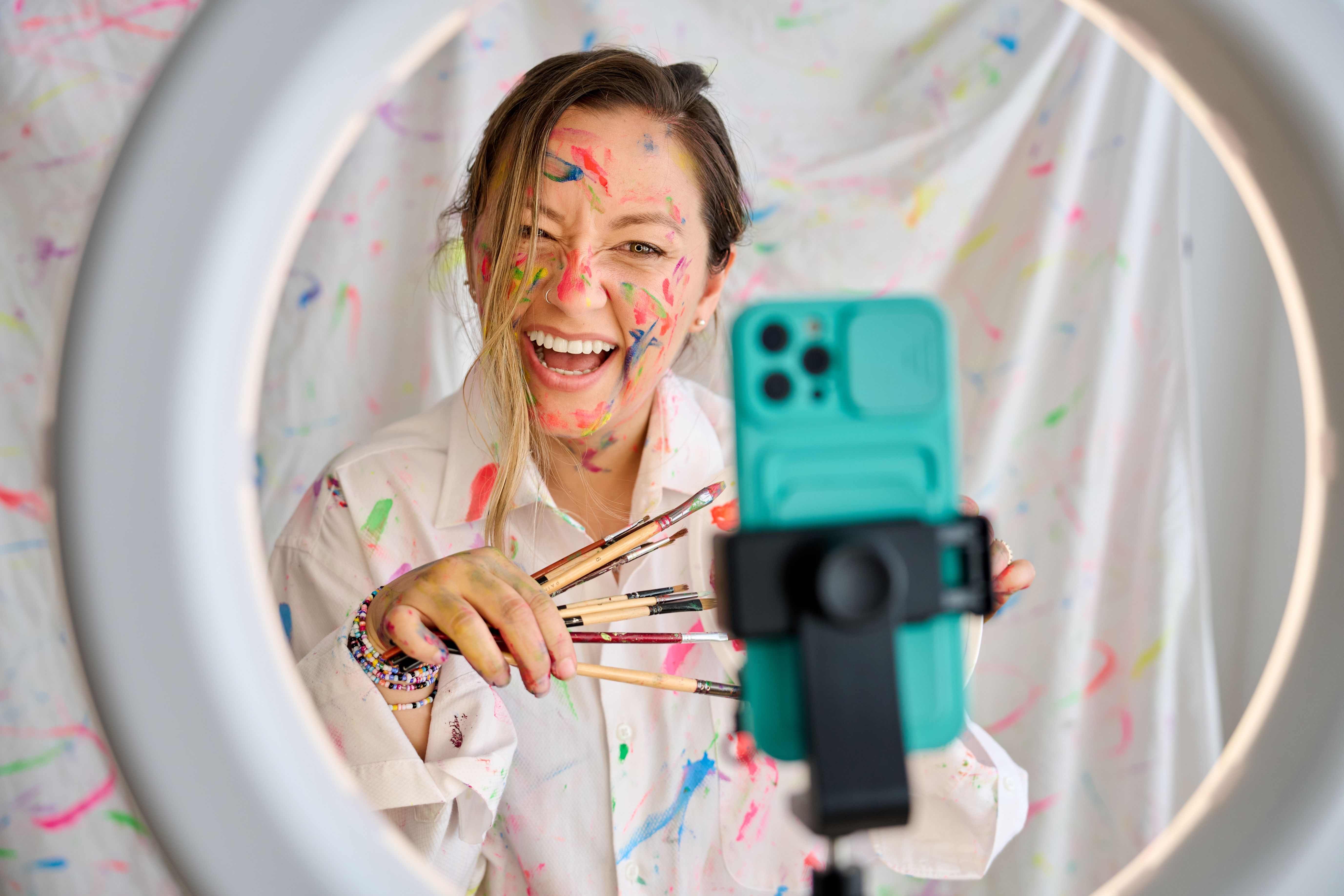 Female artist smiling while enjoying recording content for social media with mobile phone. Art, creativity and technology concept. (Photo by David Espejo/Getty Images)