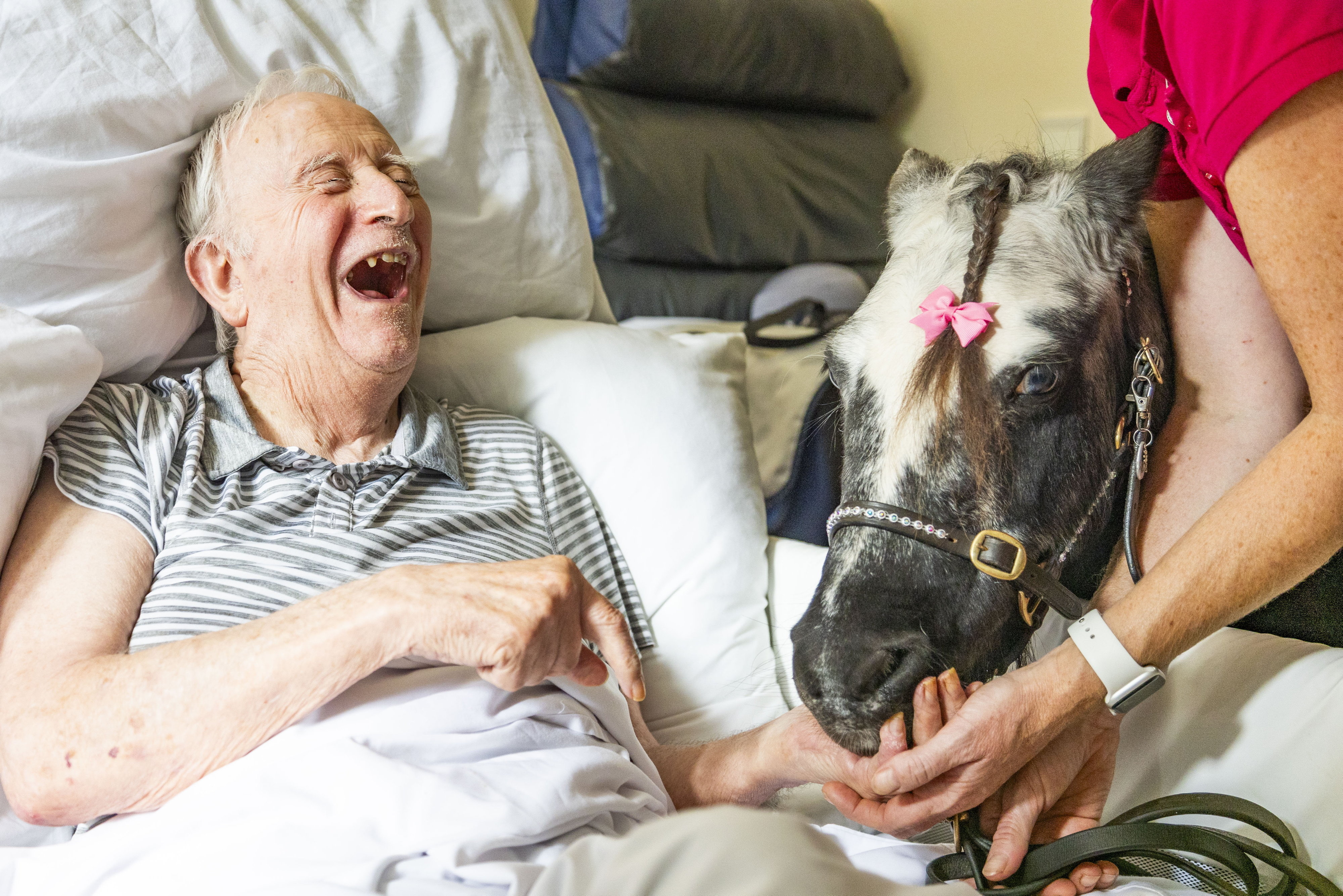 Poppy the therapy pony meets residents at King’s Court care home in Swindon, UK on September 24, 2024. Poppy, 16, and her stablemate Tinks, 17, are just 30 inches tall and bring joy to hospitals, schools and care home. (Photo by Tom Wren/South West News Service)