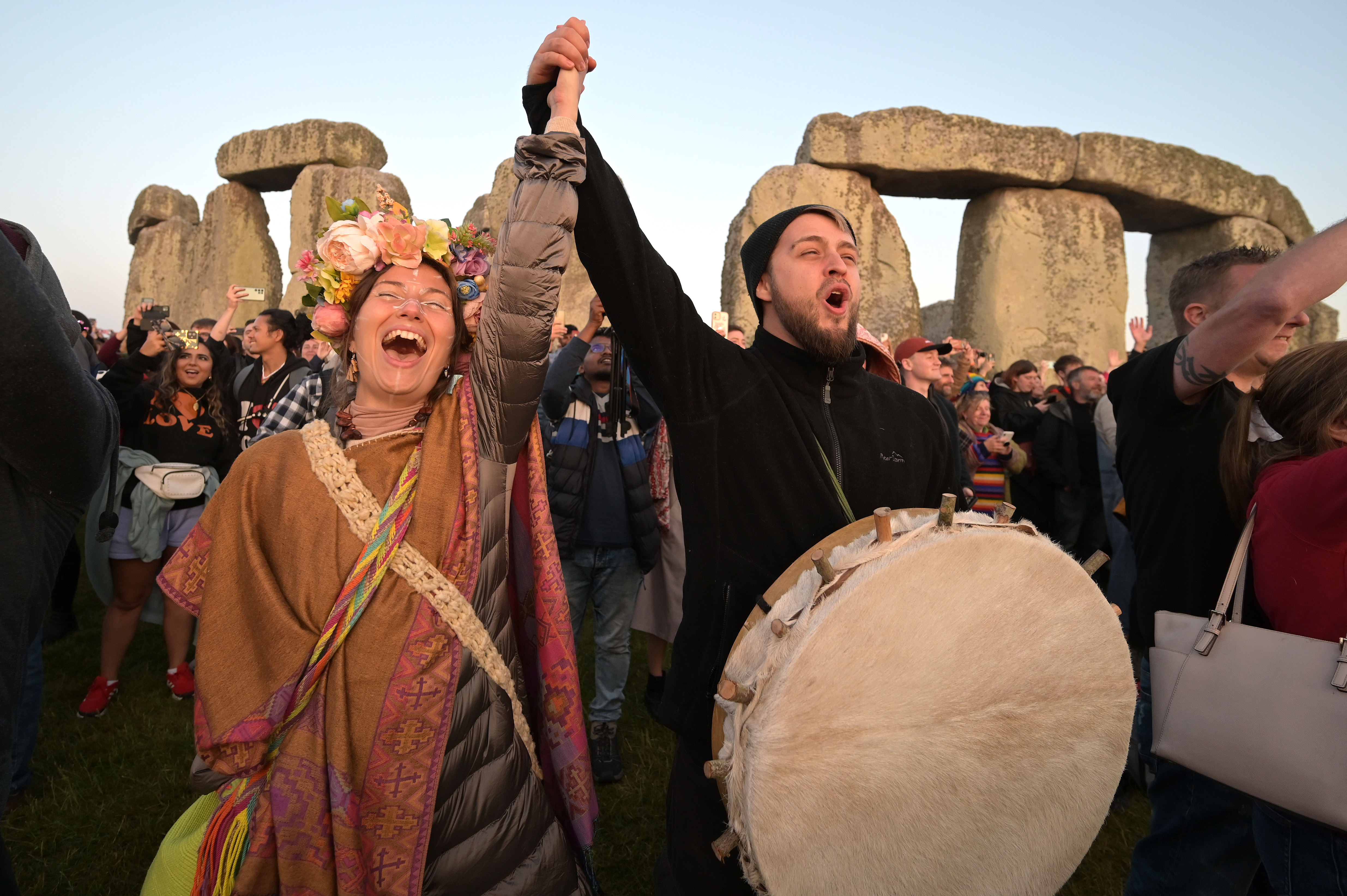 Revellers including Hippies and Druids return to Stonehenge to celebrate the summer Solstice on June 21, 2023. Thousands descended on the ancient stones to witness the sunrise on the longest day of the year. The sun rose at 4:49am and the official Solstice officially begins at 3;57pm GMT. English Heritage allow controlled access to the ancient stone circle to allow the celebration that marks the official start of summer. (Photo by Martin Dalton/Rex Features/Shutterstock)