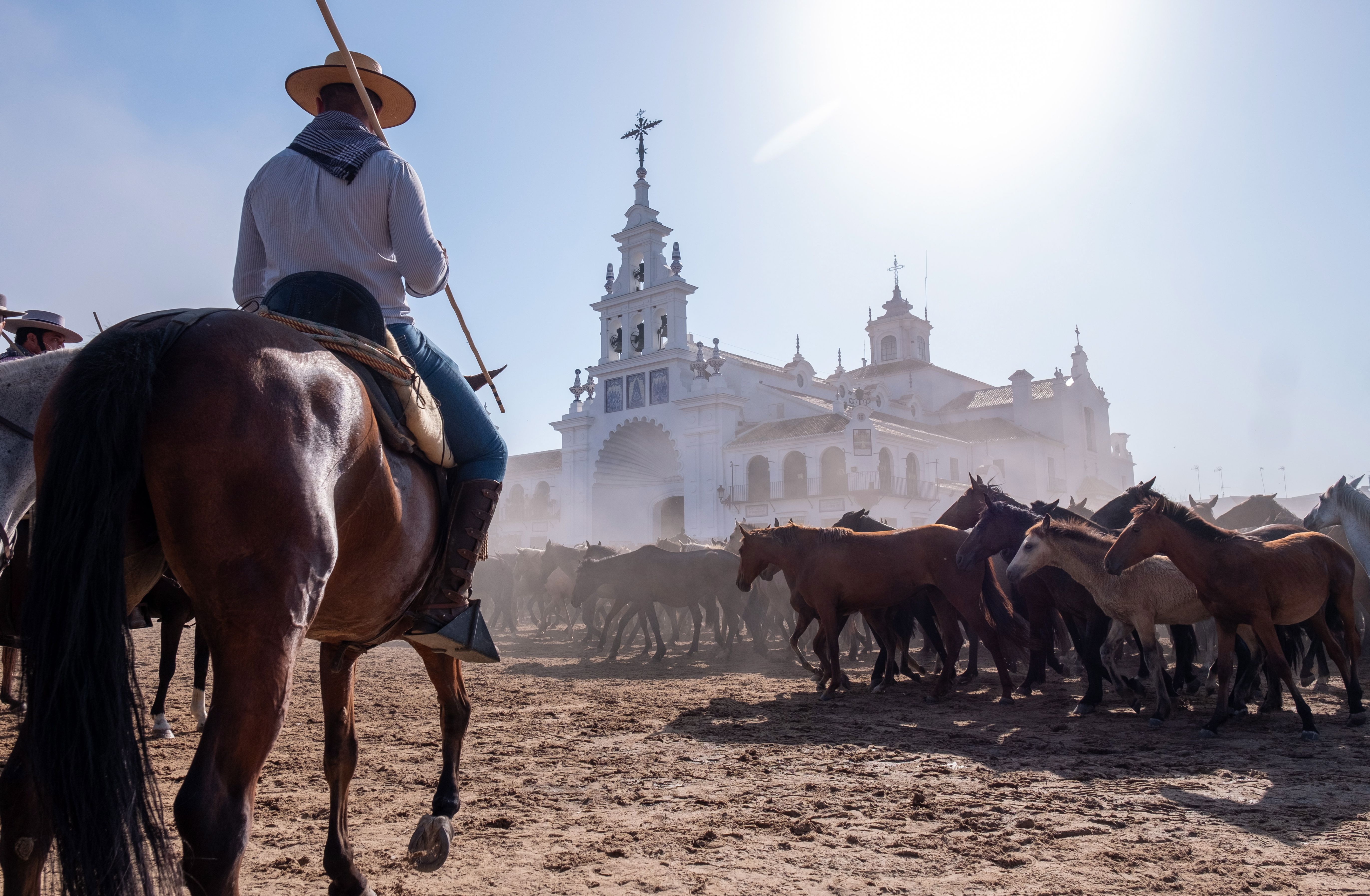 Some of the 1,500 semi-wild horses trot in front of the Chapel of El Rocio on their way to the pen during the traditional “Saca de las Yeguas” round-up in Almonte, Huelva, southern Spain on June 26, 2023. In a tradition held for more than 500 years, annually on 26 June several locals called “yeguerizos” from the town of Almonte search their herds, that have been grazing freely in several enclaves of Donana Natural Park, and move then to the town. (Photo by Julian Perez/EPA)