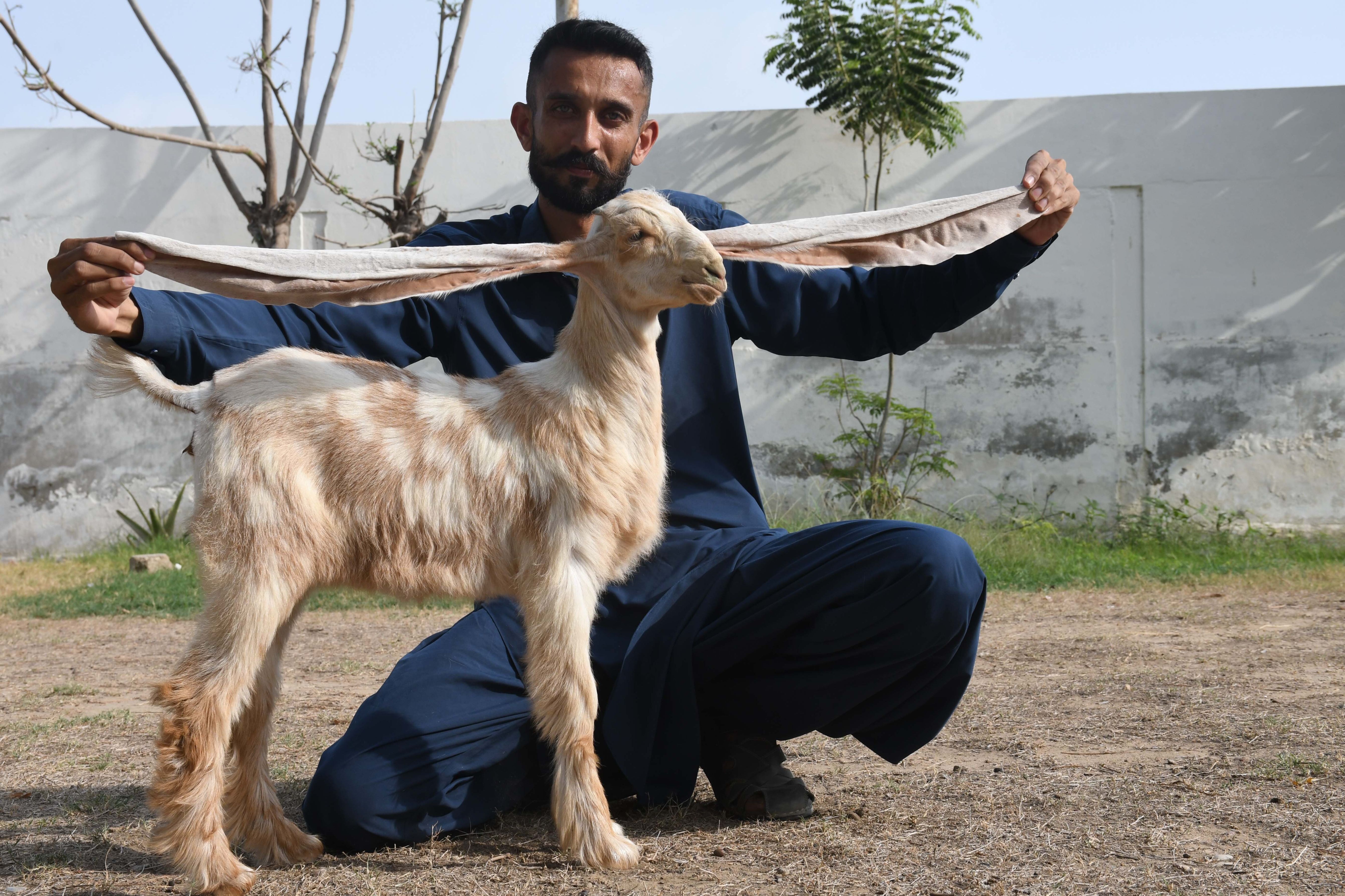 Breeder of baby goat Mohammad Hasan Narejo shows ears of 2-month-old female baby goat named Simbi in Karachi, Pakistan on June 07, 2023. Simbi has the world's longest ears which are 55 cm. (Photo by Sabir Mazhar/Anadolu Agency via Getty Images)