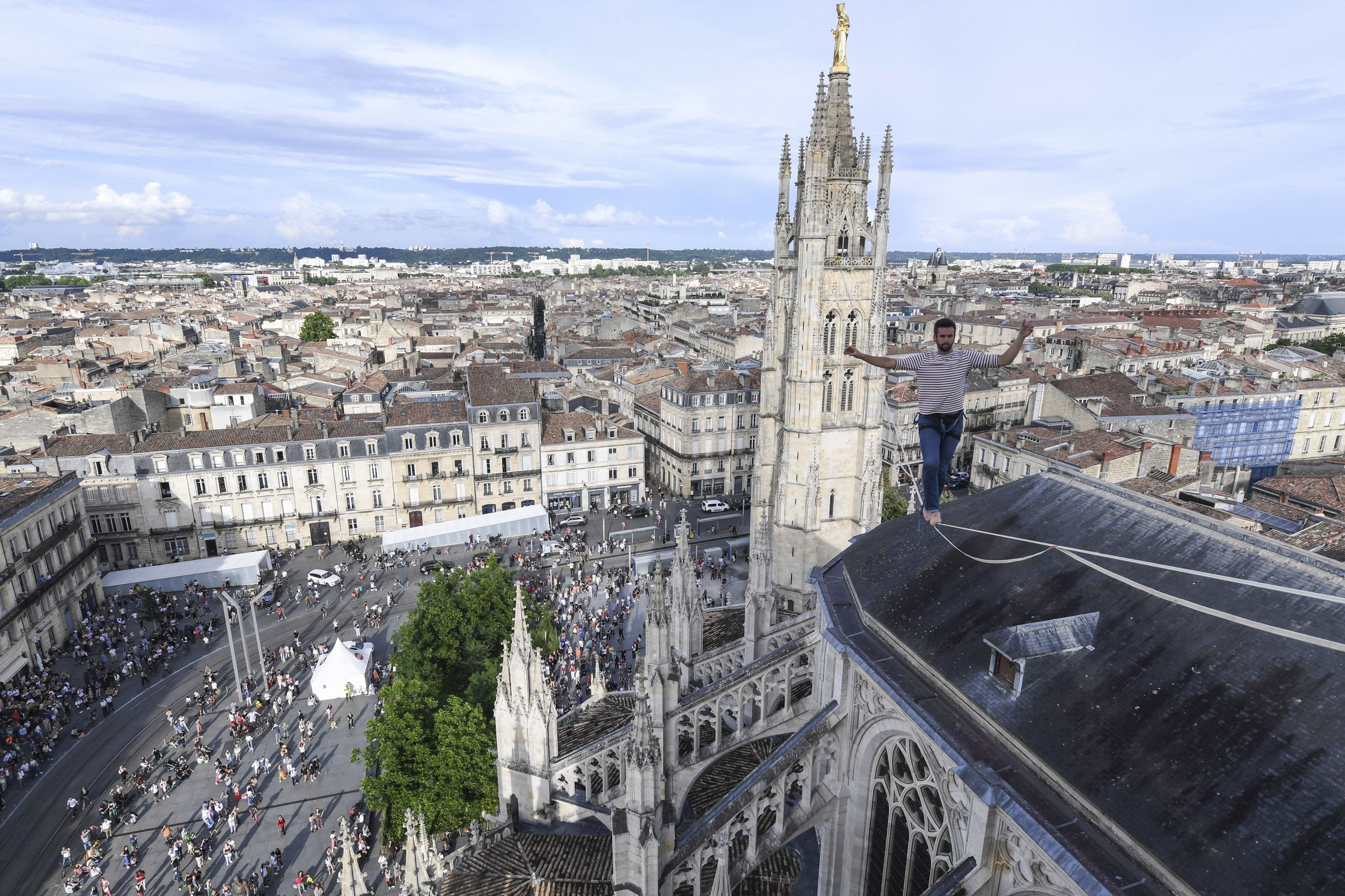 Tightrope walker and artist Nathan Paulin crosses Bordeaux on a wire from the Pey Berland Tower and the northwest spire of Saint-André Cathedral, in Bordeaux, on June 9, 2023. (Photo by Mehdi Fedouach/AFP Photo)
