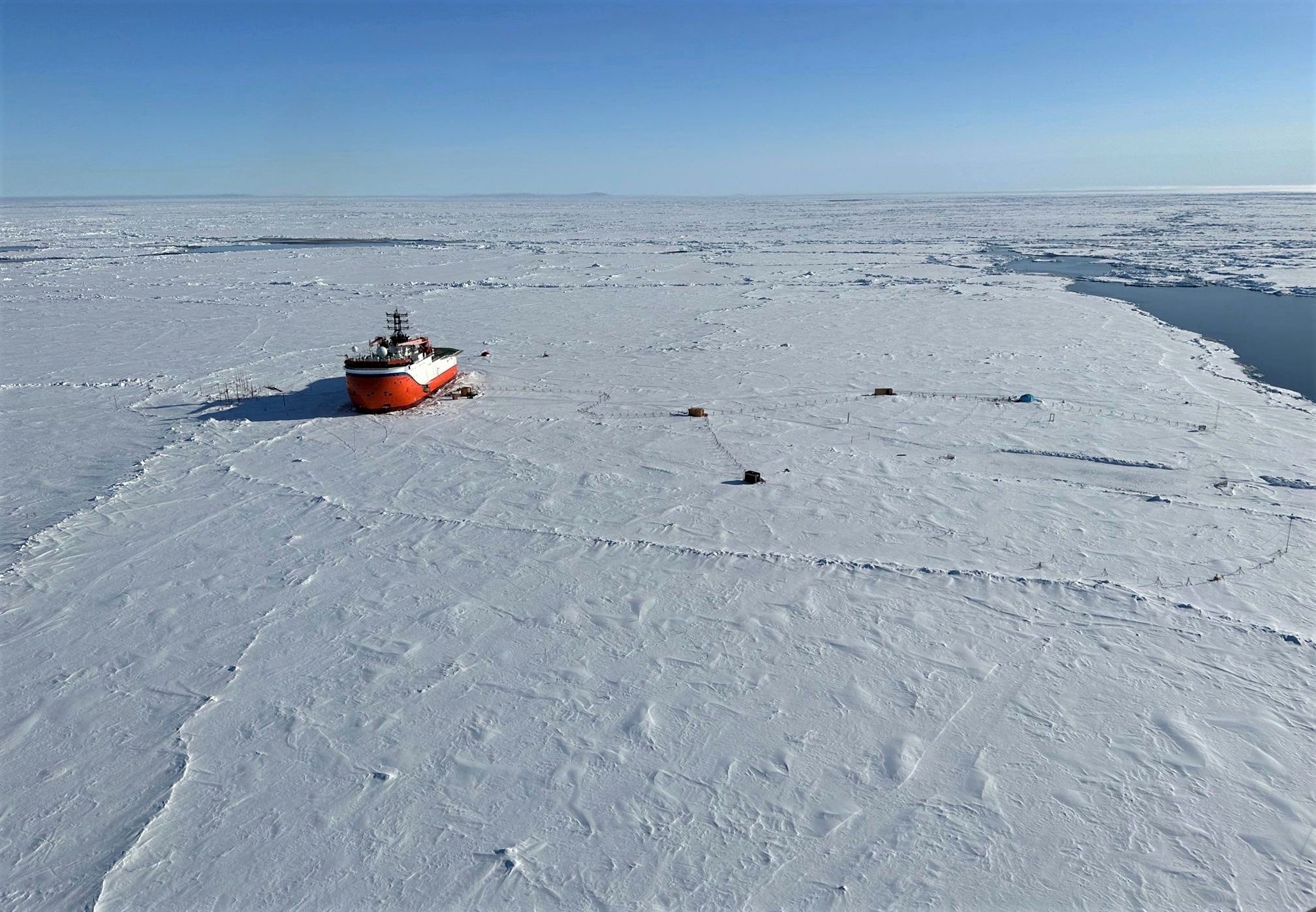 Russian scientific vessel Severny Polyus is seen caught in the arctic ice some 440km south of the north pole on June 6, 2023. A Russian national onboard the ship was evacuated at the request of their Russian counterparts. The Norwegian authorities launched a Super Puma helicopter from Longyearbyen, the main town of Svalbard, 500 nautical miles (925 km) away, to evacuate the Russian, whose state of health has was deemed too critical to be treated on board ship. “It's at the extreme limit of what the helicopter can do” in terms of range, spokesman for the Norwegian Rescue Center in Bodo, Rune Danielsen, told AFP. (Photo by Sysselmesteren Svalbard/AFP Photo)