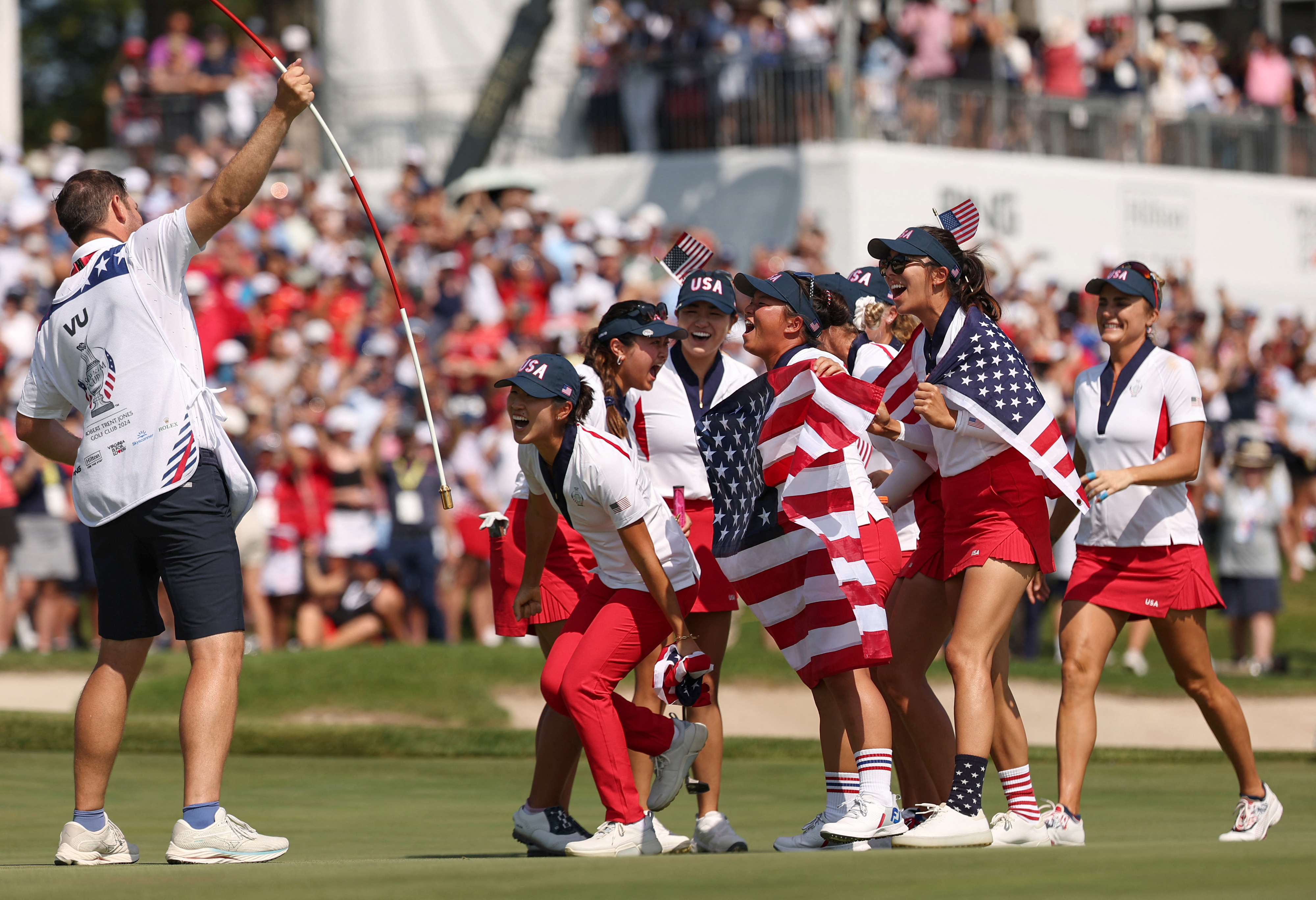 Team United States reacts after winning the Solheim Cup during the Sunday Singles matches during the final round of the Solheim Cup 2024 at Robert Trent Jones Golf Club on September 15, 2024 in Gainesville, Virginia. (Photo by Scott Taetsch/Getty Images/AFP Photo)