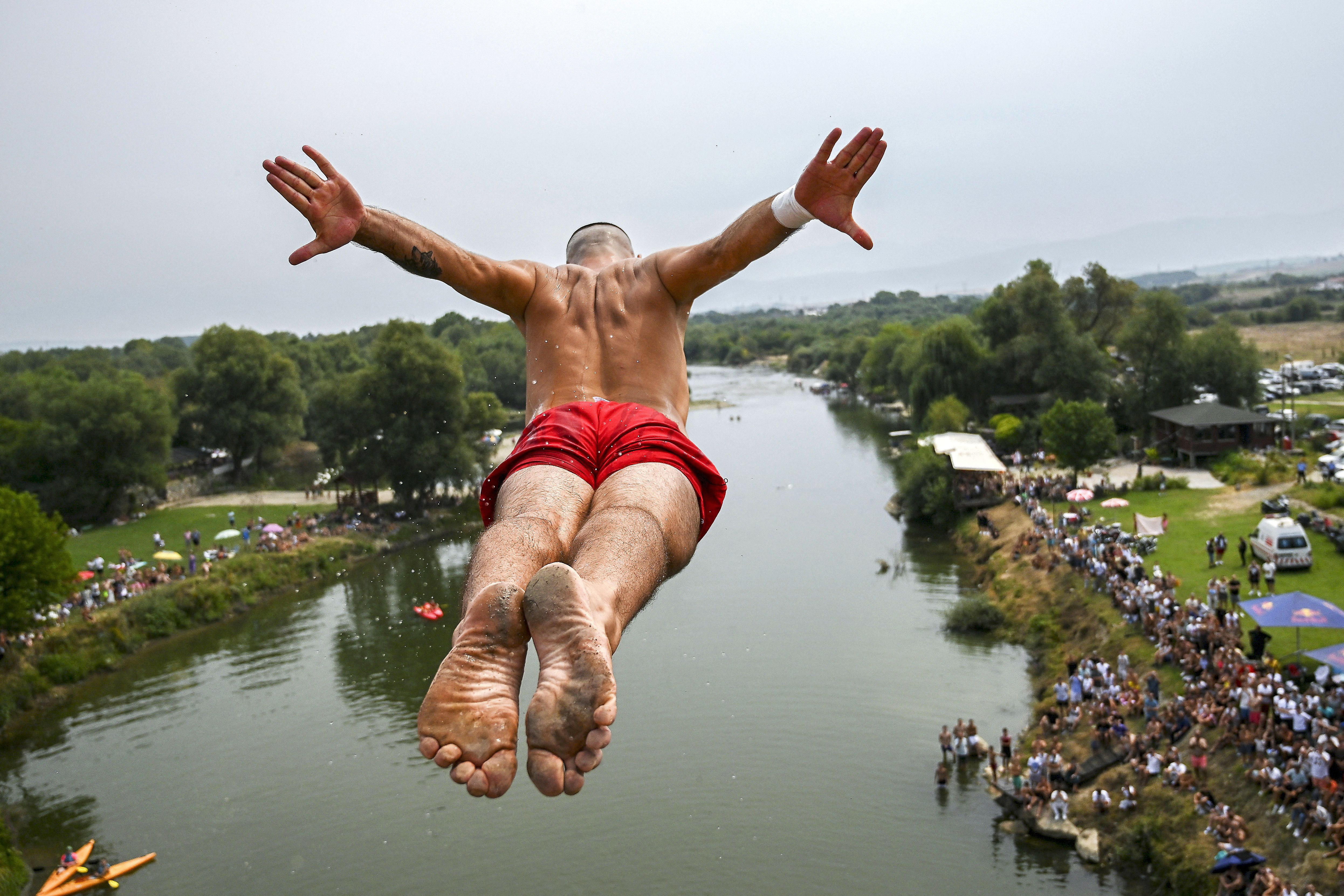 A competitor jumps from the 22-meter-high “Ura e Shenjte” bridge, or Sacred Bridge, during the annual traditional High Diving competition near the town of Gjakova, on August 18, 2024. (Photo by Armend Nimani/AFP Photo)
