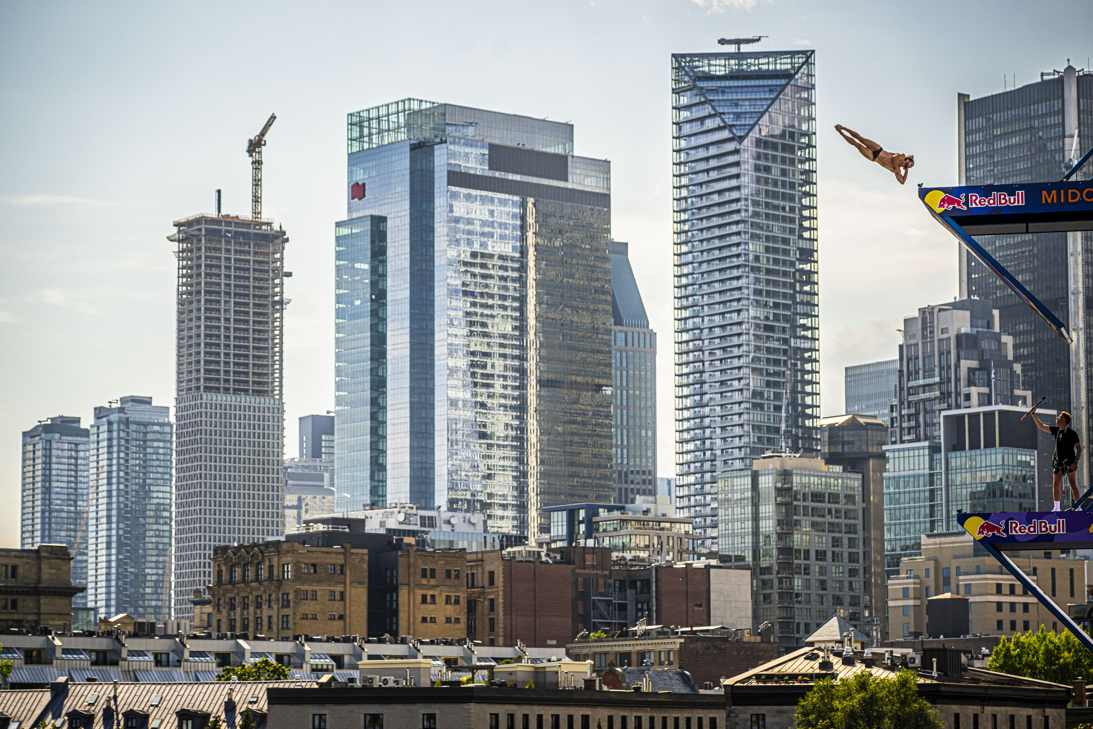 In this handout photo provided by Red Bull, David Colturi of the USA dives from the 27 metre platform during the second competition day of the sixth stop of the Red Bull Cliff Diving World Series on August 24, 2024 at Montreal, Canada. (Photo by Romina Amato/Red Bull via Getty Images)