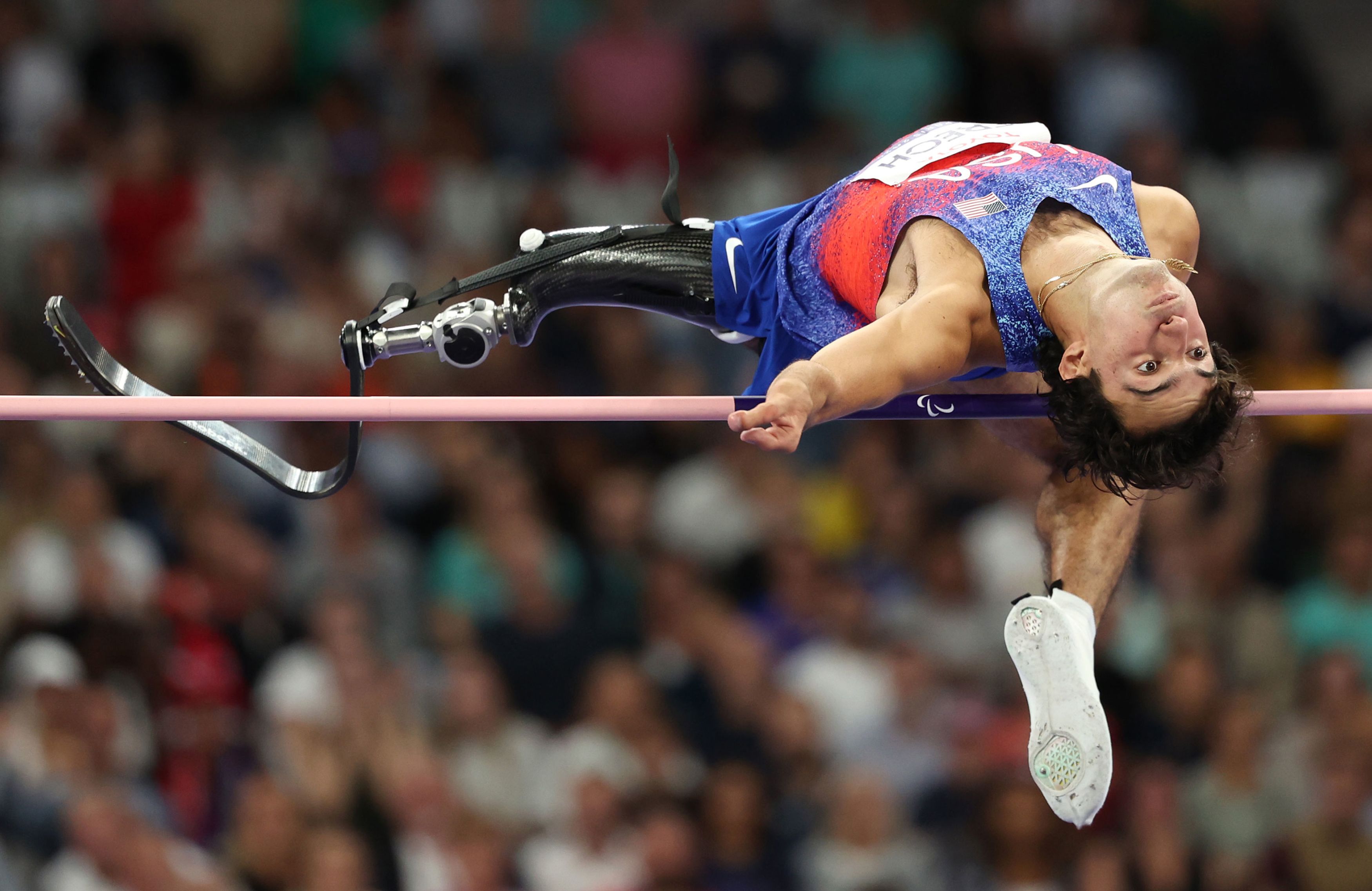 Sam Grewe of Team United States competes during the Men's High Jump - T63 Final on day six of the Paris 2024 Summer Paralympic Games at Stade de France on September 03, 2024 in Paris, France. (Photo by Ezra Shaw/Getty Images)