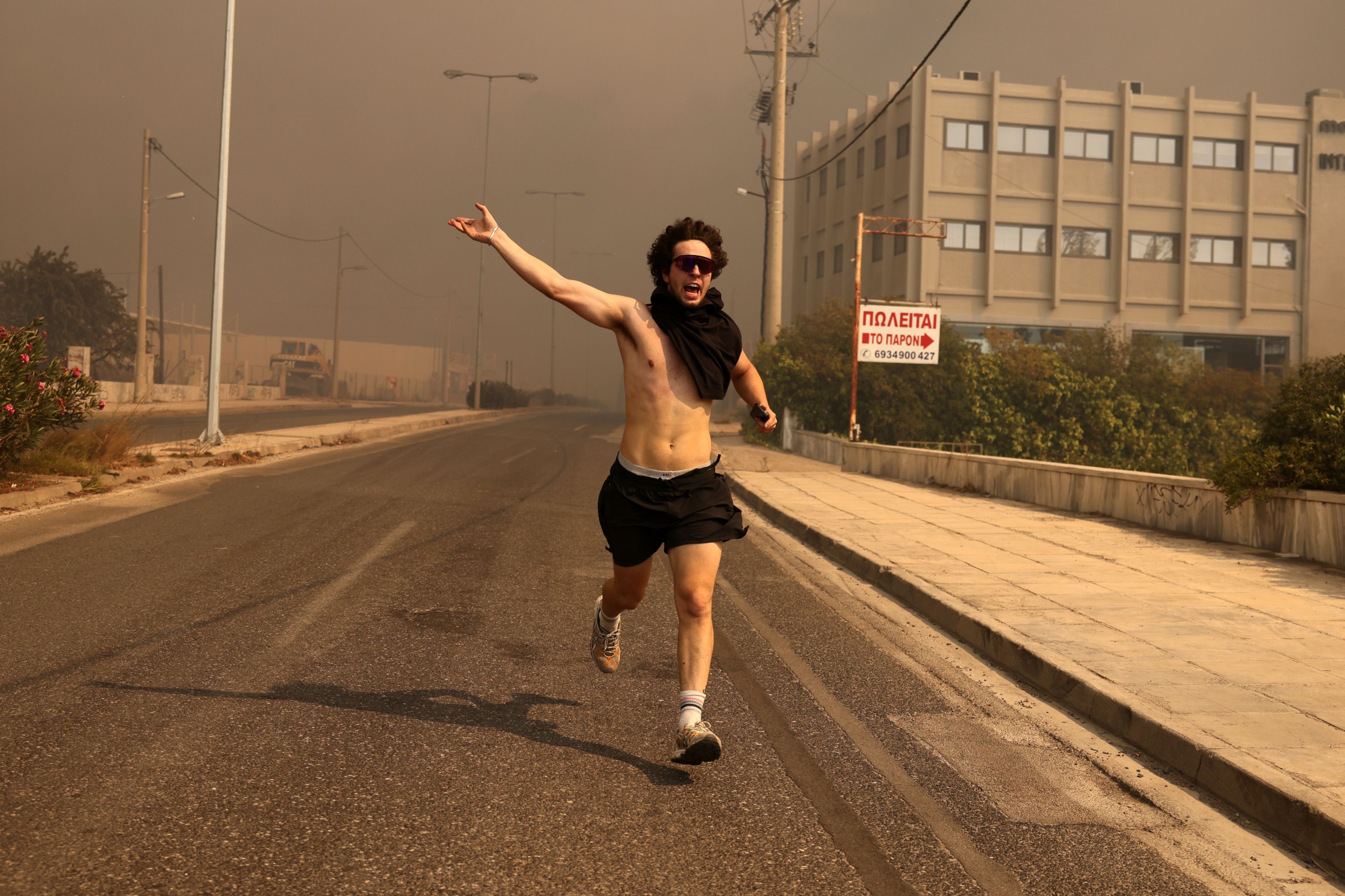 A man runs, during a wildfire in Nea Penteli near Athens, Greece, on August 12, 2024. (Photo by Costas Baltas/Anadolu via Getty Images)