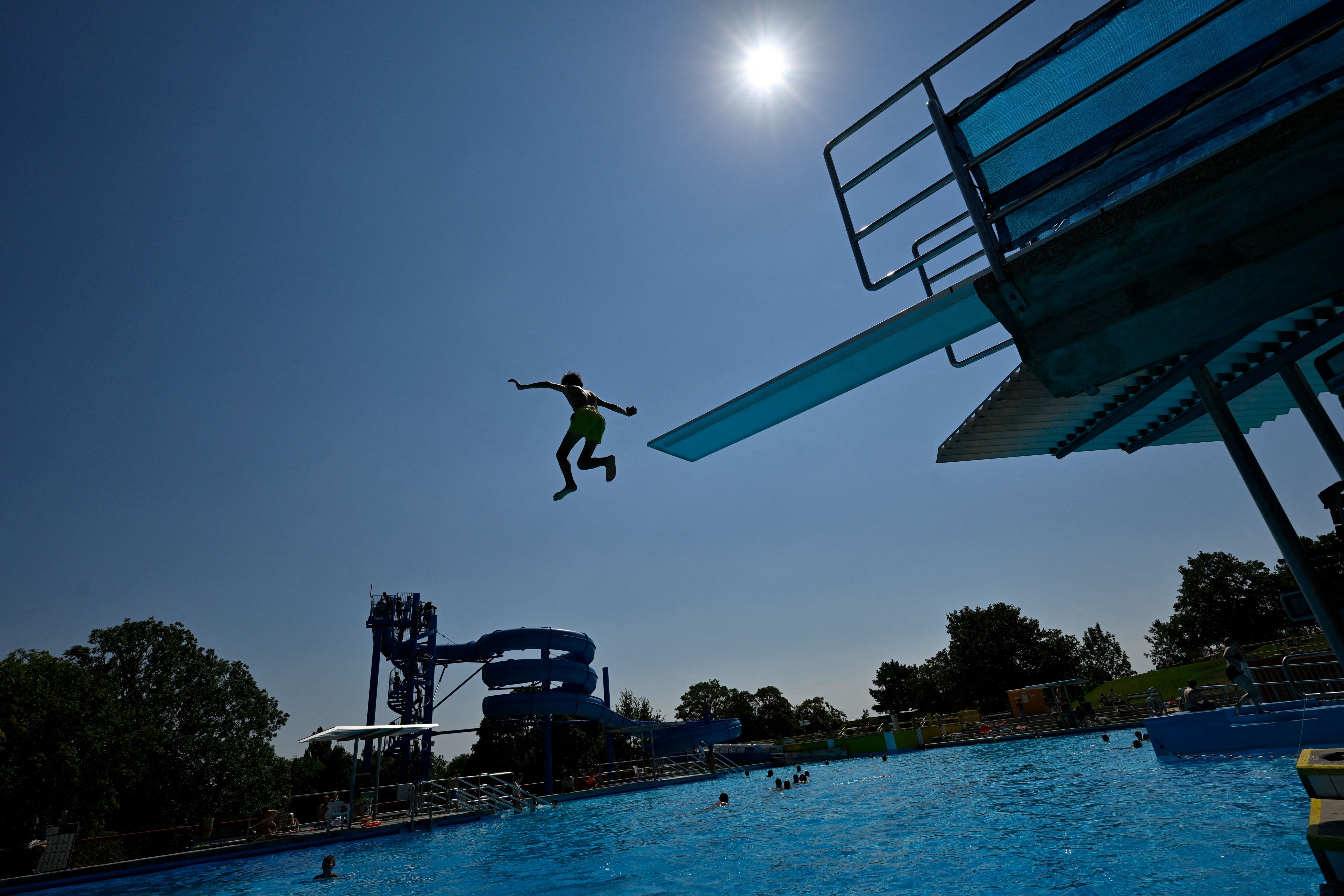 A person jumps into the Schafbergbad public pool during a heat wave, in Vienna, Austria on August 14, 2024. (Photo by Elisabeth Mandl/Reuters)