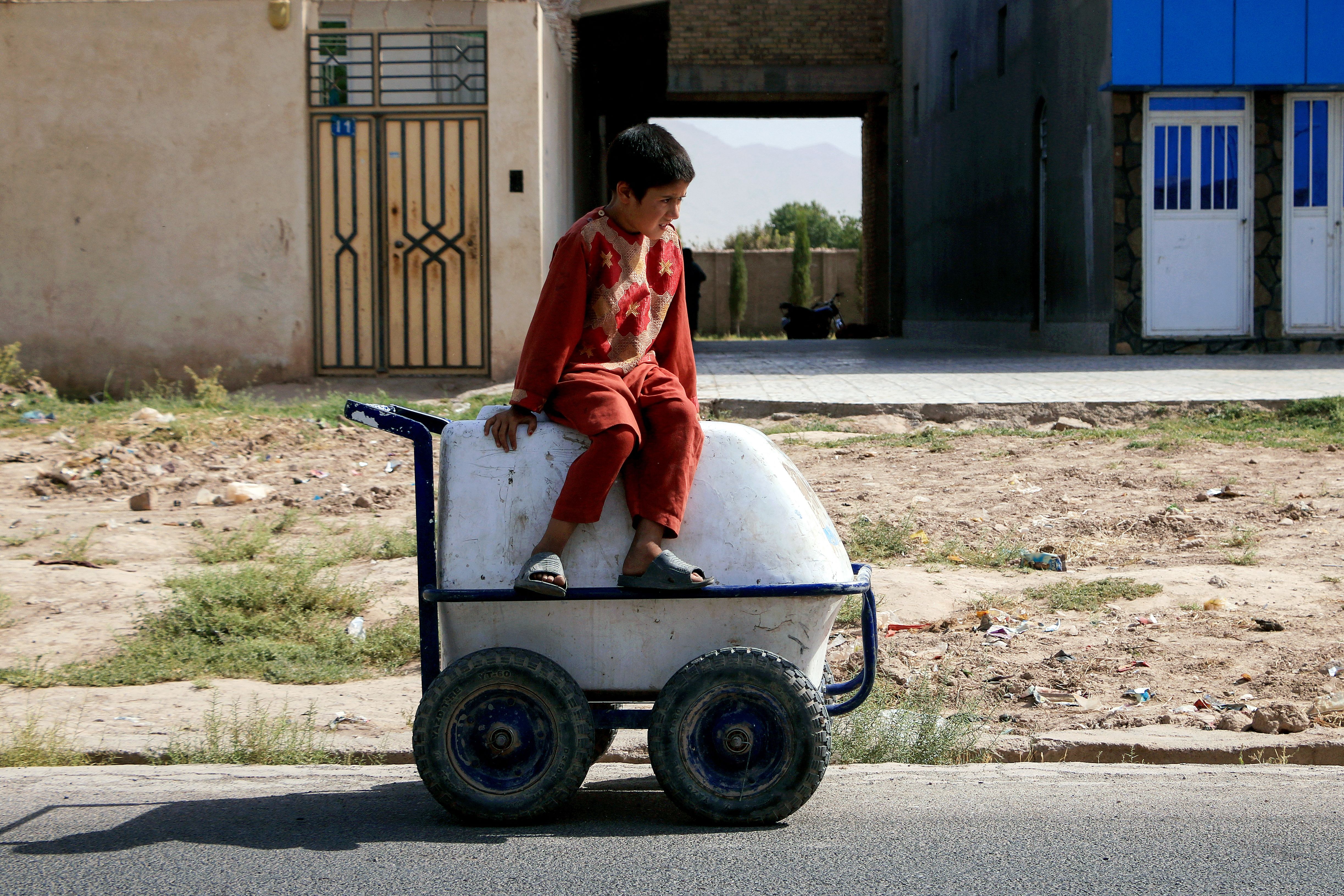 An Afghan boy sits on his cart of ice-creams as he waits for customers along street in Herat on July 29, 2024. (Photo by Mohsen Karimi/AFP Photo)