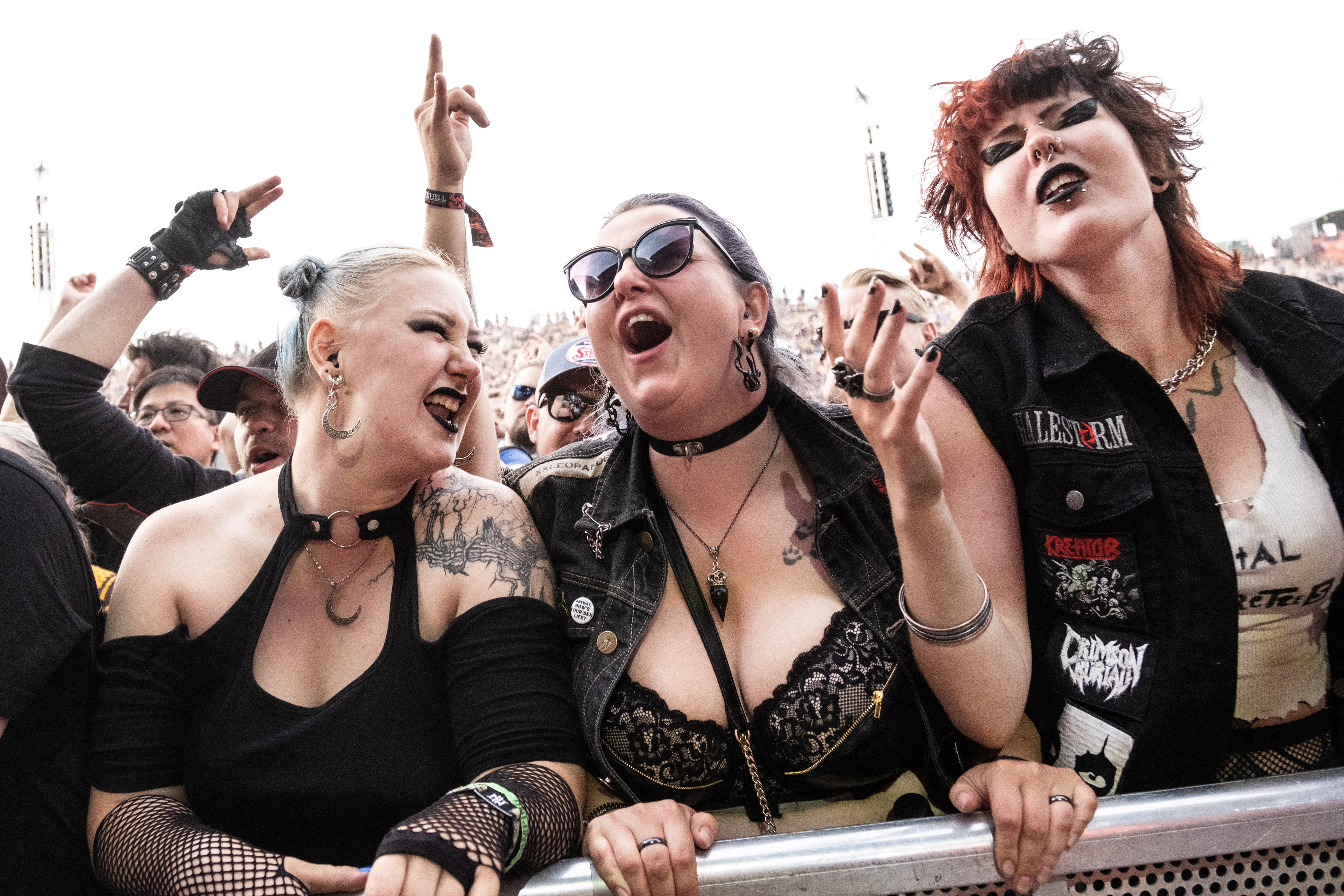 Spectators react during the performance of US rock band Halestorm with lead vocalist and guitarist Lzzy Hale during the heavy metal music Festival Copenhell, in Copenhagen, Denmark, on June 15, 2023. (Photo by Helle Arensbak/Ritzau Scanpix via AFP Photo)