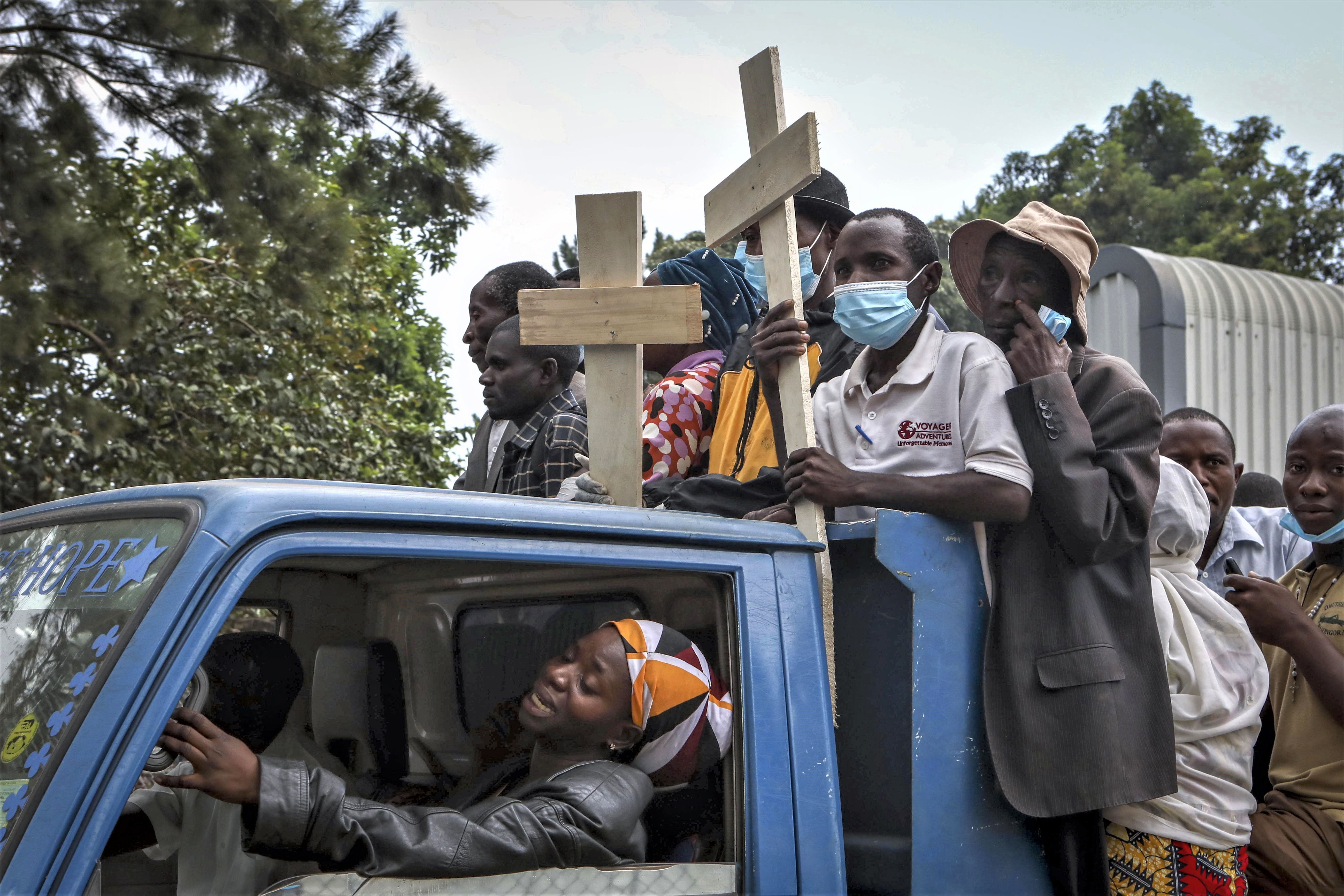 Relatives ride in the back of a truck with the coffins of villagers who were killed by suspected rebels as they retreated from Saturday's attack on the Lhubiriha Secondary School, outside the mortuary of the hospital in Bwera, Uganda Sunday, June 18, 2023. Ugandan authorities have recovered the bodies of 41 people including 38 students who were burned, shot or hacked to death after suspected rebels attacked the school in Mpondwe near the border with Congo, according to the local mayor. (Photo by Hajarah Nalwadda/AP Photo)