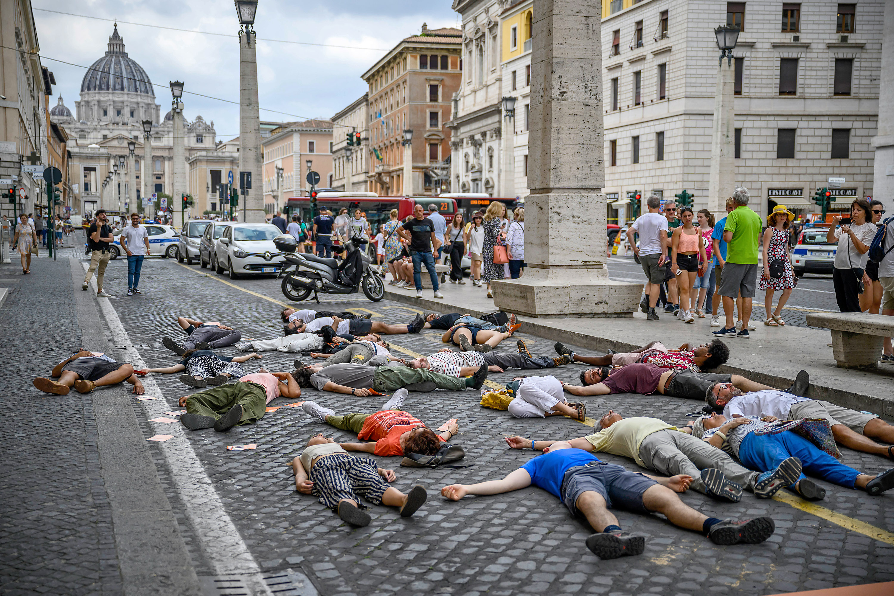 Climate activists from Ultima Generazione (Last Generation) lay down on the ground during a climate crisis protest at Via della Conciliazione, on June 29, 2023 in Rome, Italy. Two Italian climate activists from the Ultima Generazione (Last Generation) group were given a suspended prison sentence and ordered to pay nearly 30,000 in damages for glueing themselves to the base of Laocoon statue in the Vatican museum last year. Ultima Generazione – Last Generation is an Italian non-violent civil disobedience campaign born in 2021 within the Extinction Rebellion movement and now independent. Ultima Generazione demands the reopening of disused coal plants and cancel the project of new drilling for the research and extraction of natural gas, and to increase solar and wind energy by at least 20GW this year, to create thousands of new jobs in renewable energy. (Photo by Antonio Masiello/Getty Images)