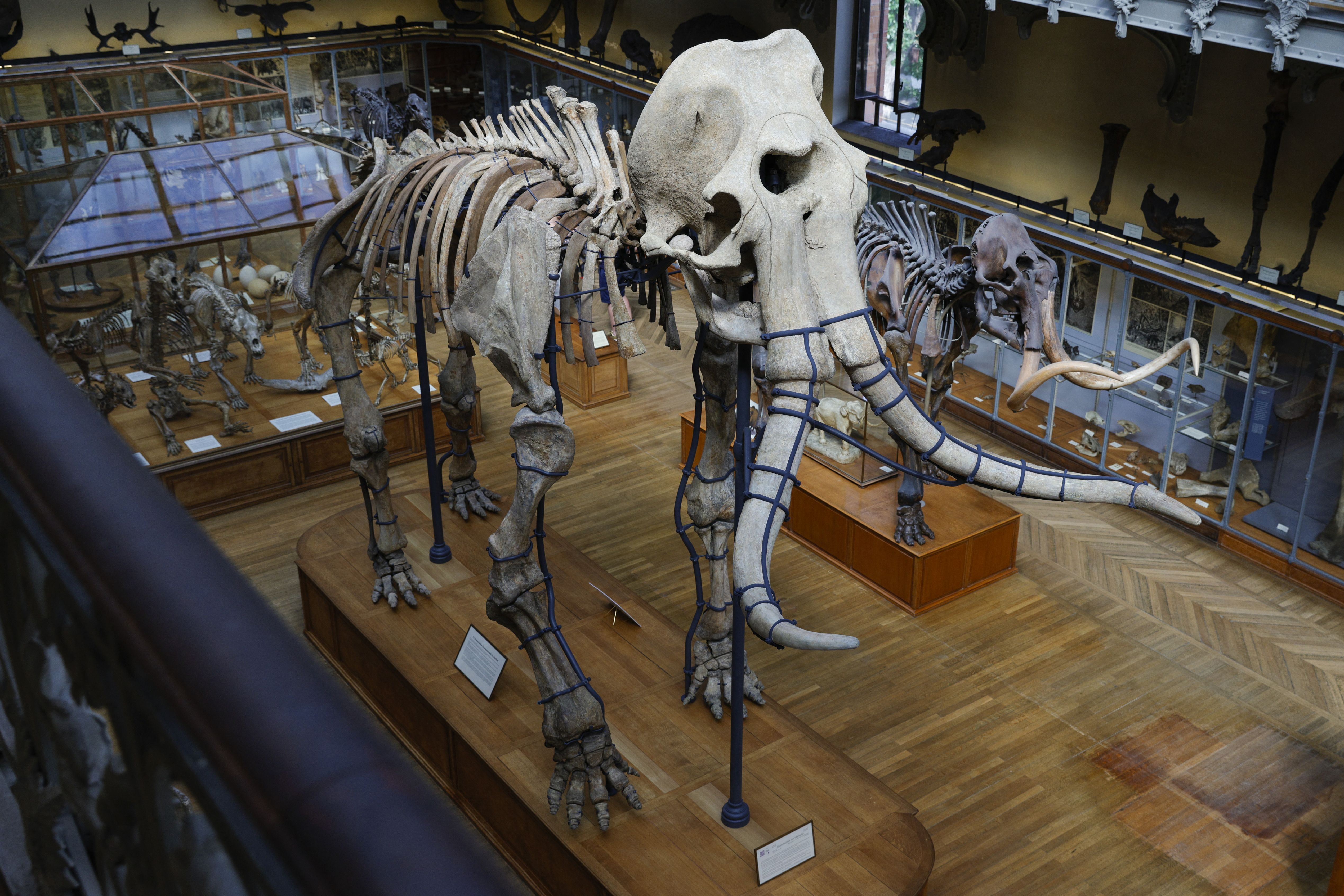 A picture shows the skeleton of the Durfort mammoth on display after a complete restoration at the French National Museum of Natural History (MNHN) situated in the Jardin de Plantes botanical garden in Paris, on June 27, 2023. (Photo by Geoffroy Van der Hasselt/AFP Photo)