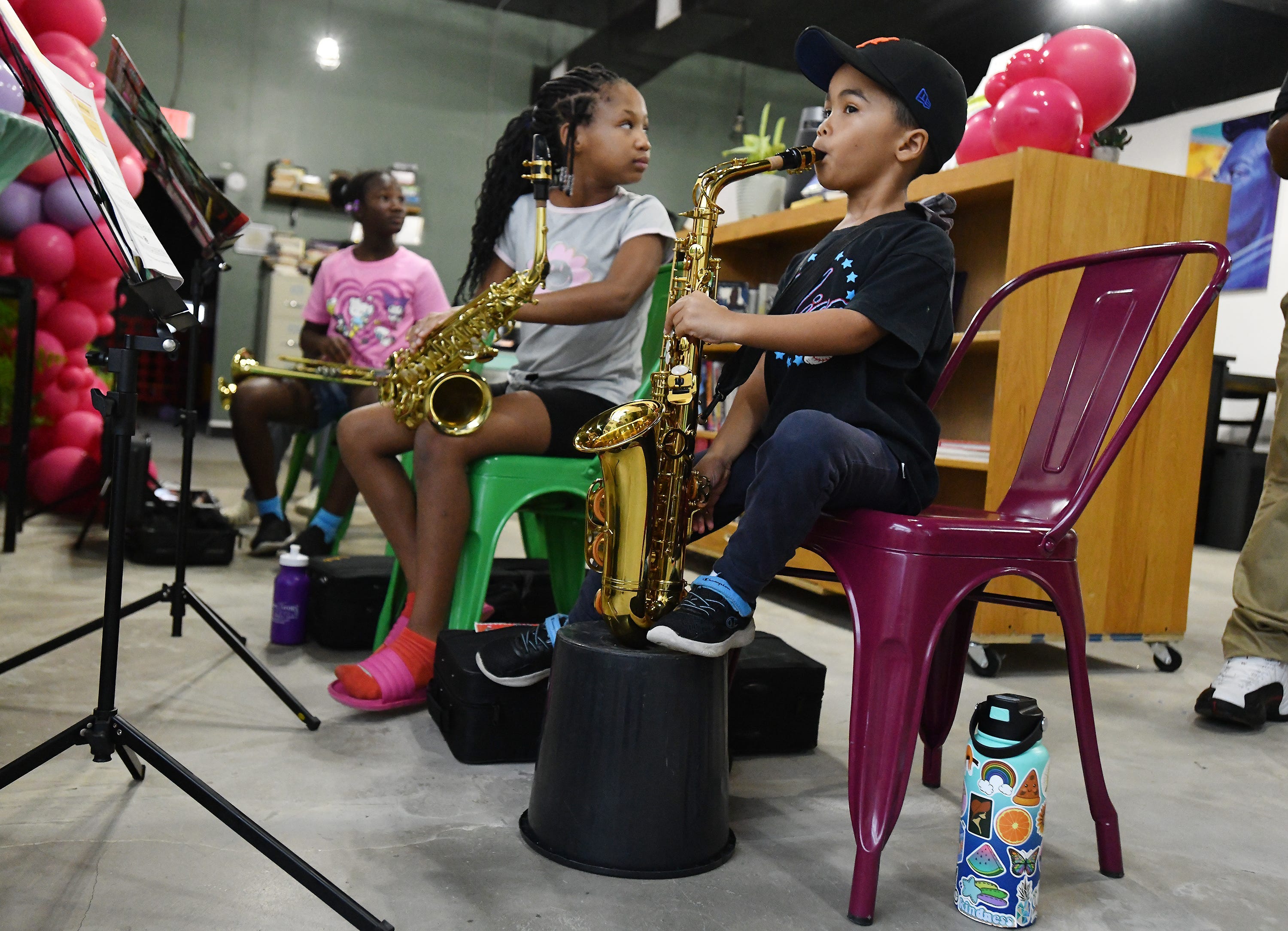 Zion Turck, 7 works on his saxophone technique during free music classes offered by Moses Evans, the band director at Highlands Middle School Wednesday, September 4, 2024 at Cafe Resistance in Jacksonville, Florida. Angie Nixon has opened Cafe Resistance, a community space on Soutel Drive for members of Jacksonville's African-American community to gather for community meetings, have a cup of coffee, bring children to read, and also offers free music lessons for children. (Photo by Bob Self/Florida Times-Union via USA TODAY Network)