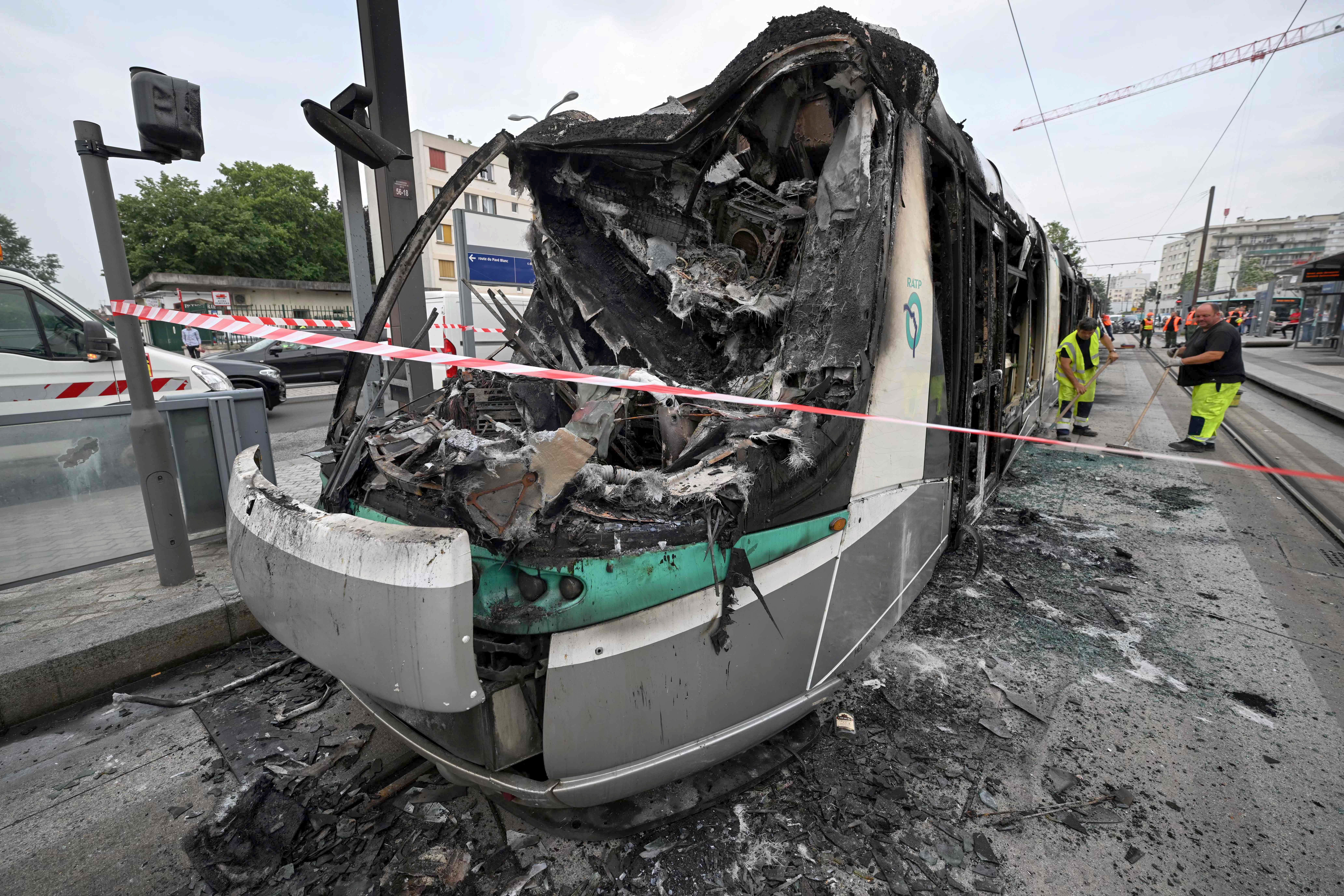 Workers sweep up the debris of a burnt tram destroyed during protests the previous night in Clamart, southwest of Paris, on June 29, 2023. Protests erupted across the greater Paris region that saw protesters burn cars, lorries and trams in reaction to the shooting by police of a 17-year-old boy at point-blank range on June 27, 2023, in Nanterre, Paris, in an incident that has reignited debate in France about police tactics long criticised by rights groups over the treatment of people in low-income suburbs, particularly ethnic minorities. (Photo by Emmanuel Dunand/AFP Photo)