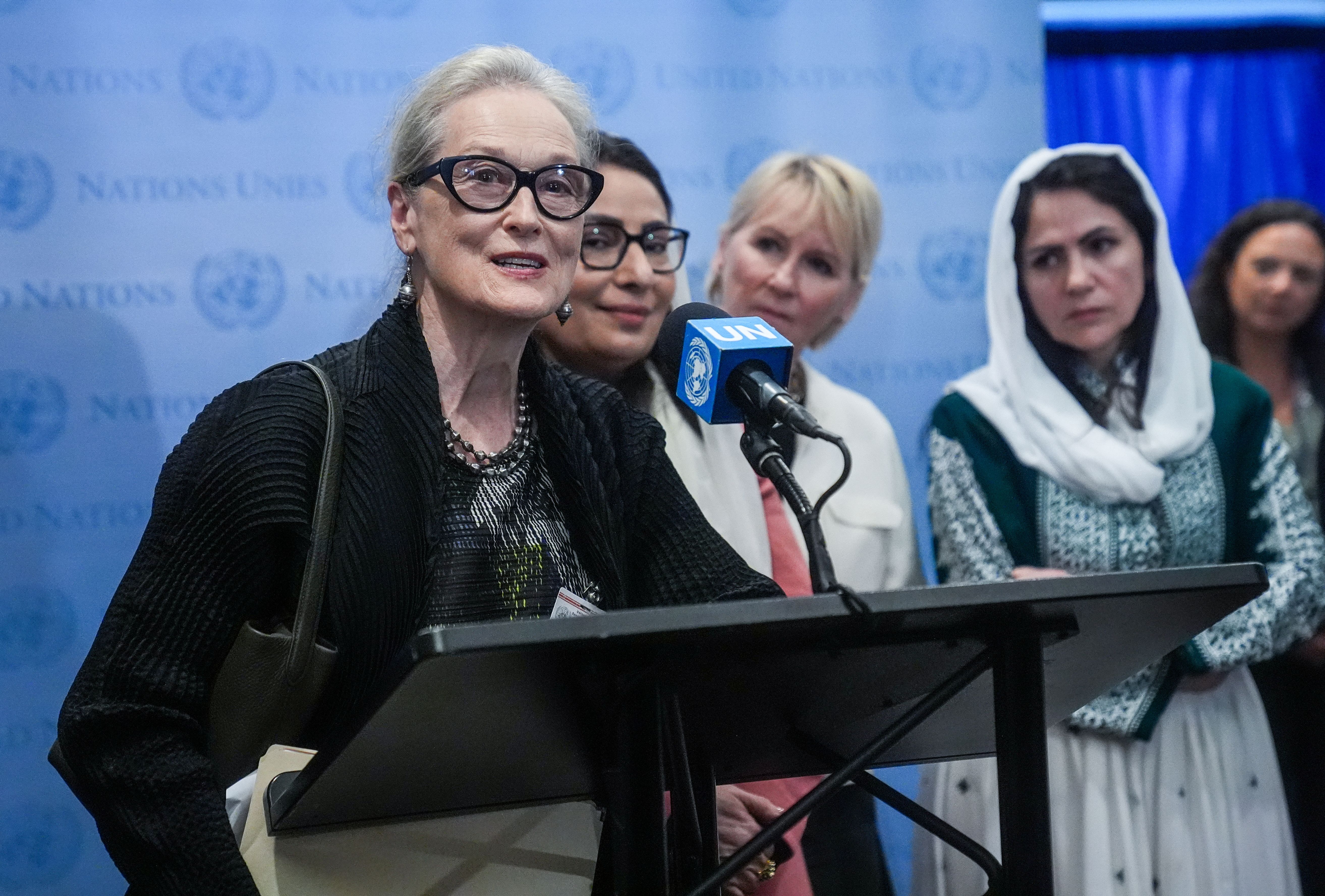Oscar-winning American actor and activist Meryl Streep talks to the press along with other female speakers after attending the meeting on the Inclusion of Women in the Future of Afghanistan, at UN Headquarters in New York, United States on September 23, 2024. (Photo by Selcuk Acar/Anadolu via Getty Images)
