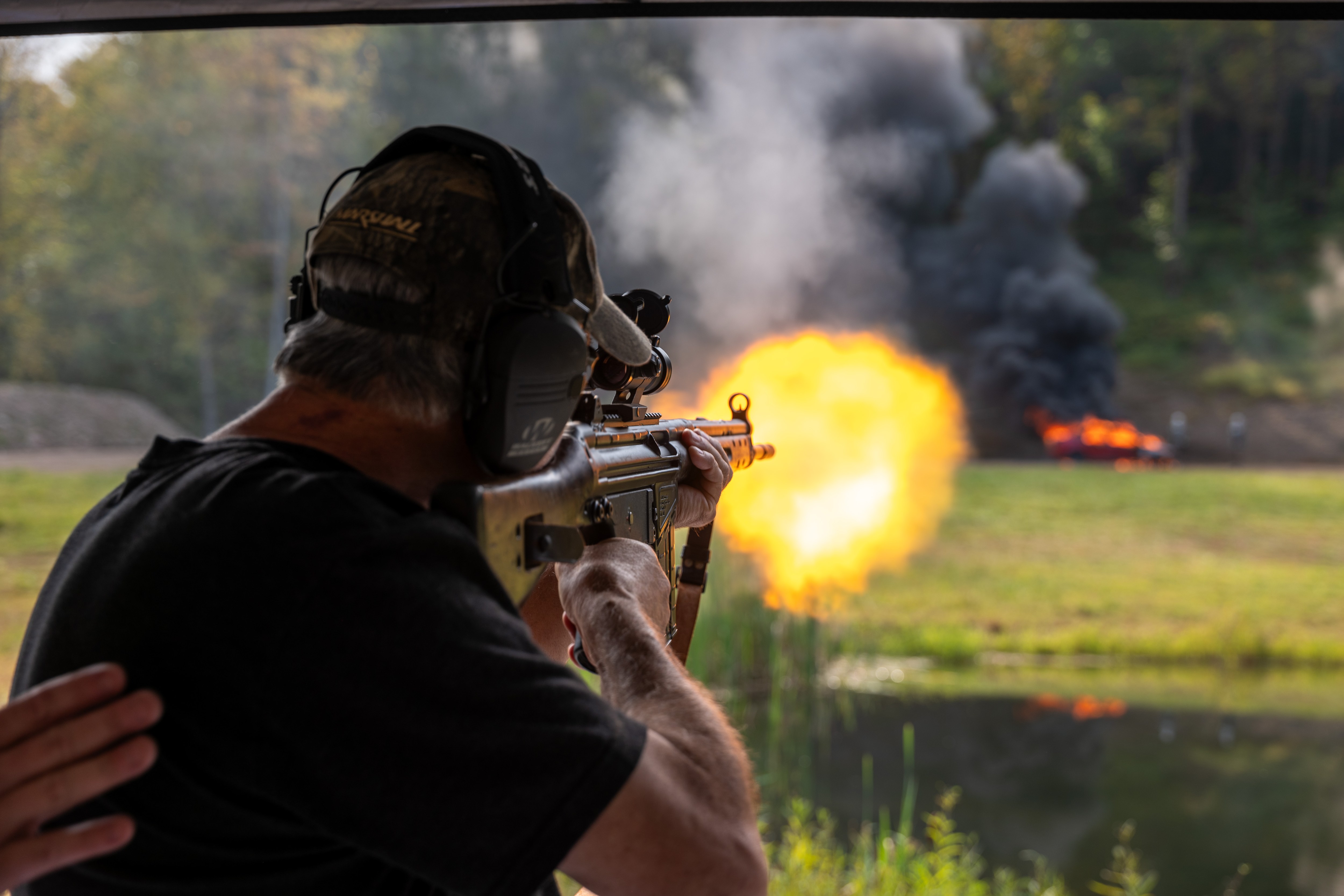 Gun enthusiasts attend the annual Machine Gun Shoot sponsored by Shooters Gauntlet on September 21, 2024 in Monroe, Pennsylvania. The shoot, which has been held since 2016, lets members of the public and others shoot machine guns at targets in a controlled and secure wooded location. The two-day event features raffles, workshops, vendors and opportunities to rent and fire a variety of weapons. According to recent data, in 2021 Americans bought an estimated 19 million guns. (Photo by Spencer Platt/Getty Images)