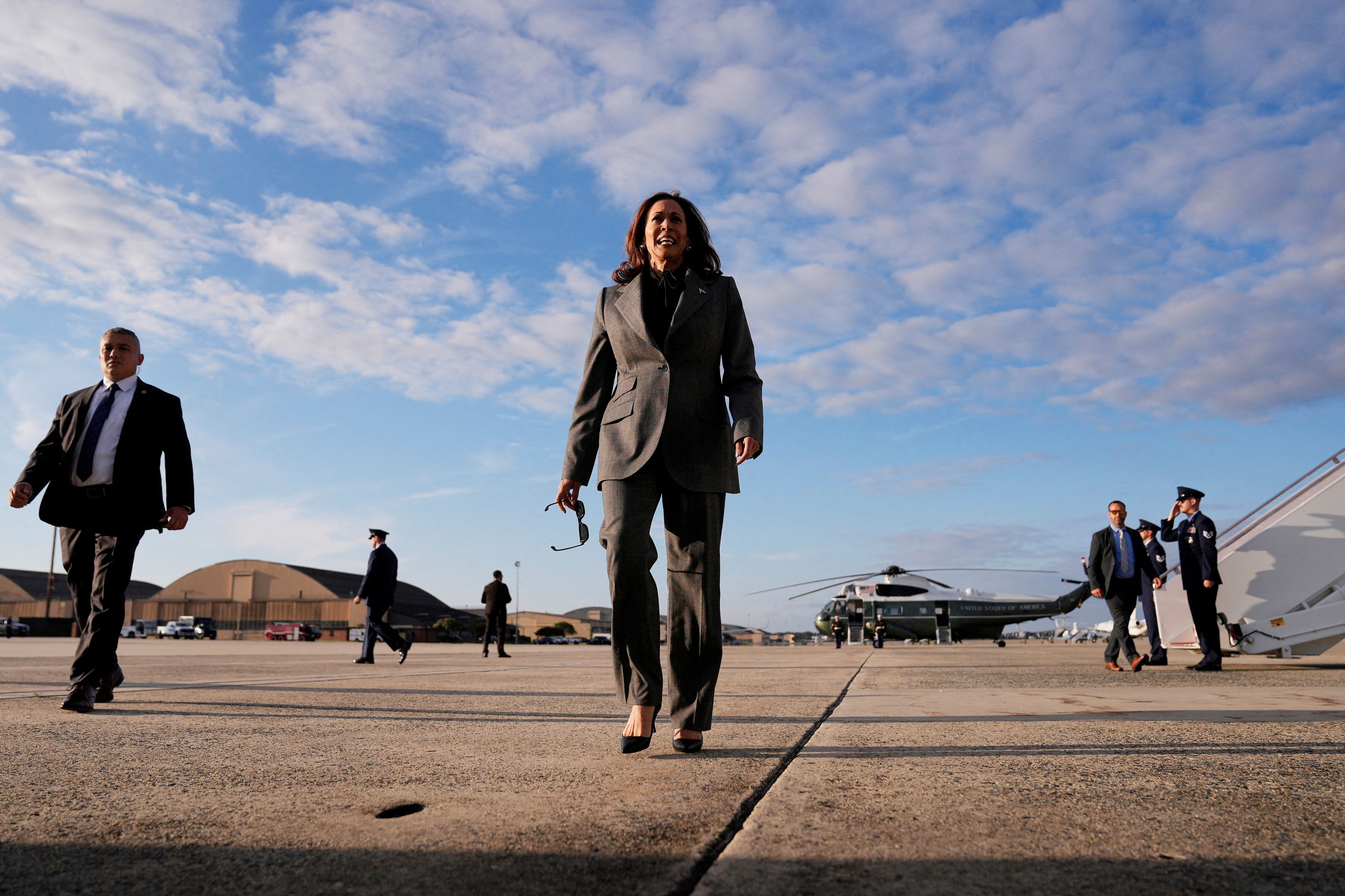 Democratic presidential nominee Vice President Kamala Harris walks over to speak to members of the media upon her arrival at Andrews Air Force Base, Maryland on September 22, 2024. (Photo by Matt Rourke/Reuters)