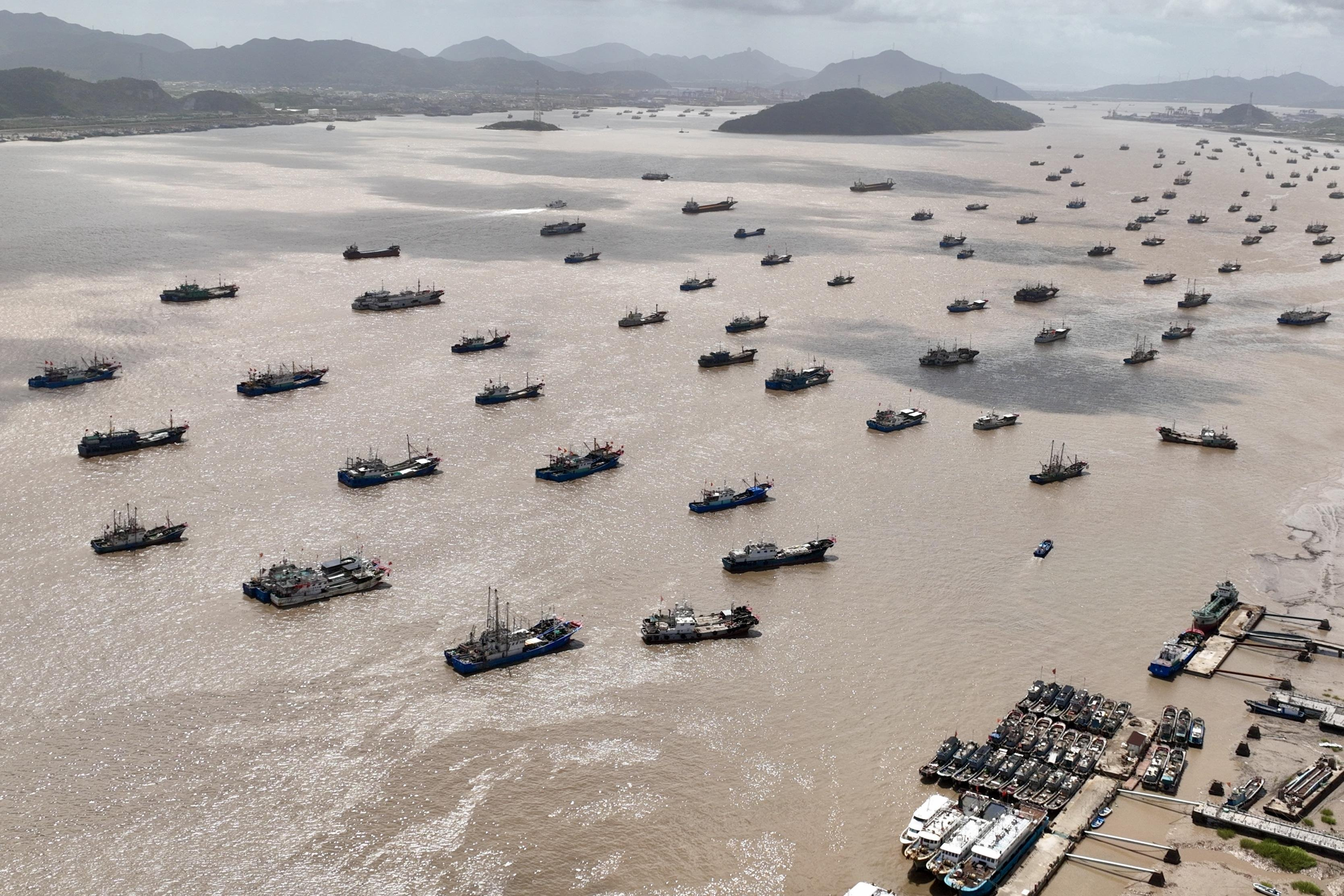 Aerial photo shows fishing vessels anchoring at a harbor to avoid approaching Typhoon Pulasan in Ningbo City, south China's Zhejiang Province, on September 19, 2024. (Photo by Rex Features/Shutterstock)