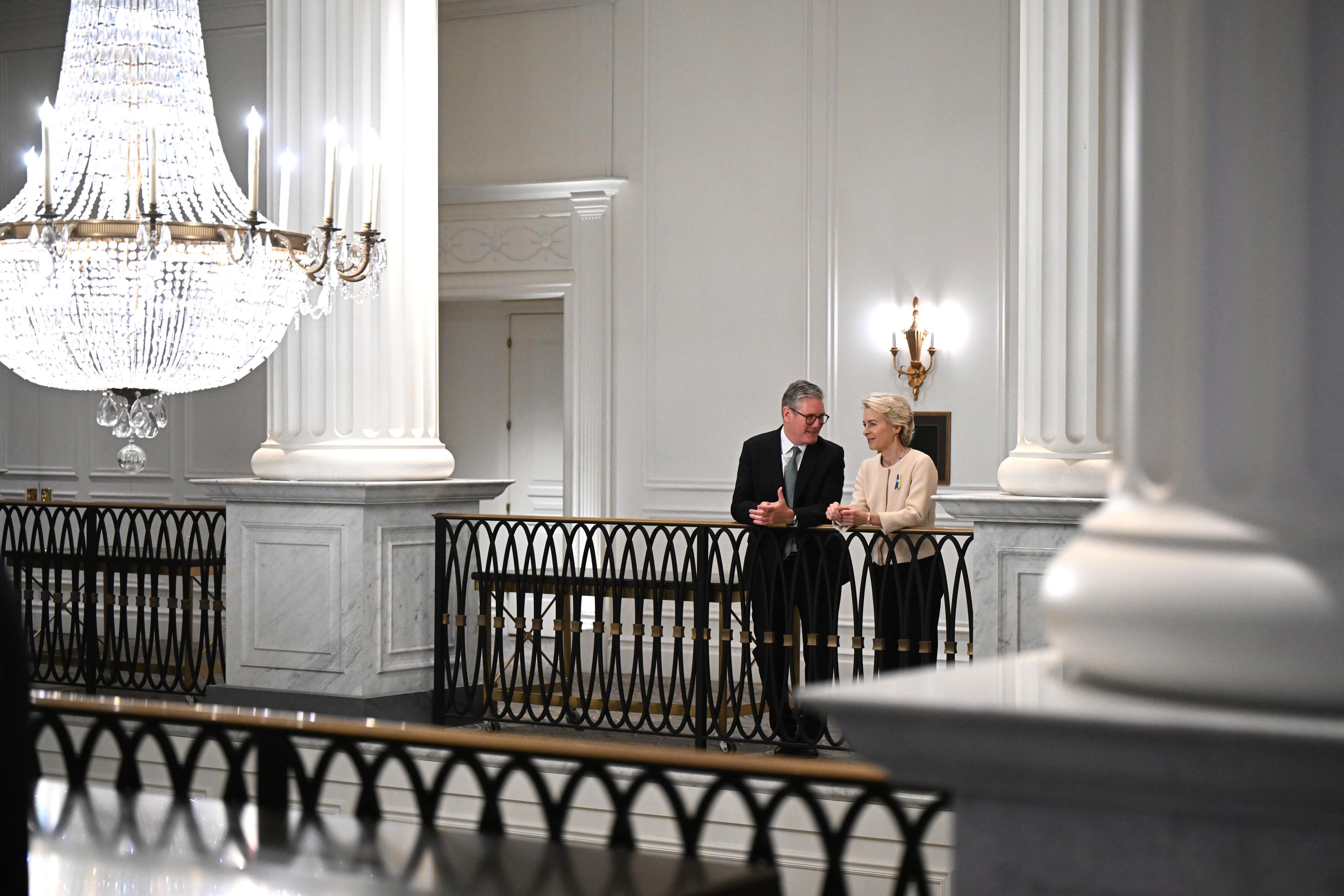 Britain's Prime Minister Keir Starmer (L) speaks President of the European Commission Ursula von der Leyen (R) on the sidelines of the 79th Session of the United Nations General Assembly at the United Nations headquarters in New York City on September 25, 2024. (Photo by Leon Neal/Pool via AFP Photo)