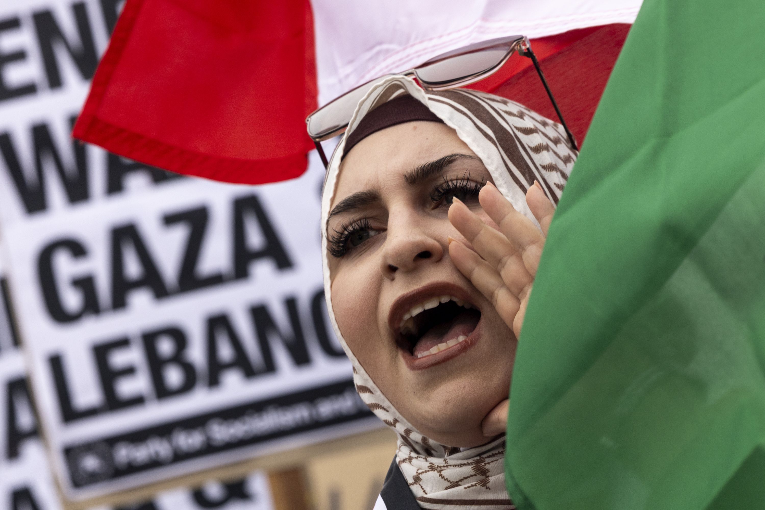 A protester waves a Lebanese flag as demonstrators gather to protest against the war on Gaza and Israeli military strikes on Lebanon in front of the Los Angeles Federal Building on Tuesday, September 24, 2024, in Los Angeles. (Photo by Etienne Laurent/AP Photo)