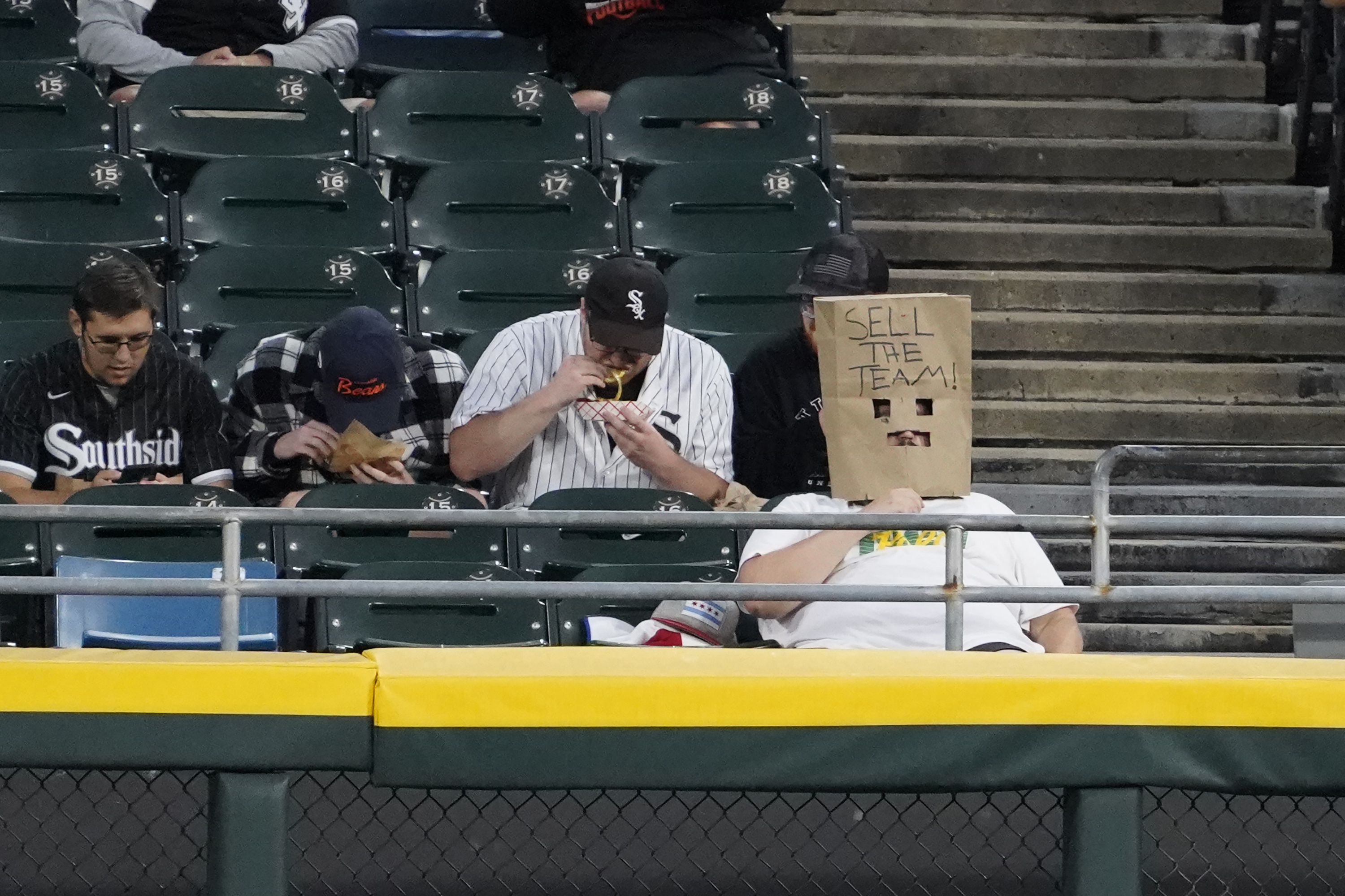 Christian Landreth, right from Glen Ellyn, Ill., wears a bag on his head during a baseball game between the Chicago White Sox and the Los Angeles Angels during the first inning. The White Sox are going for the MLB record for loses122 if they lose tonight, Wednesday, September 25, 2024, in Chicago. (Photo by David Banks/AP Photo)