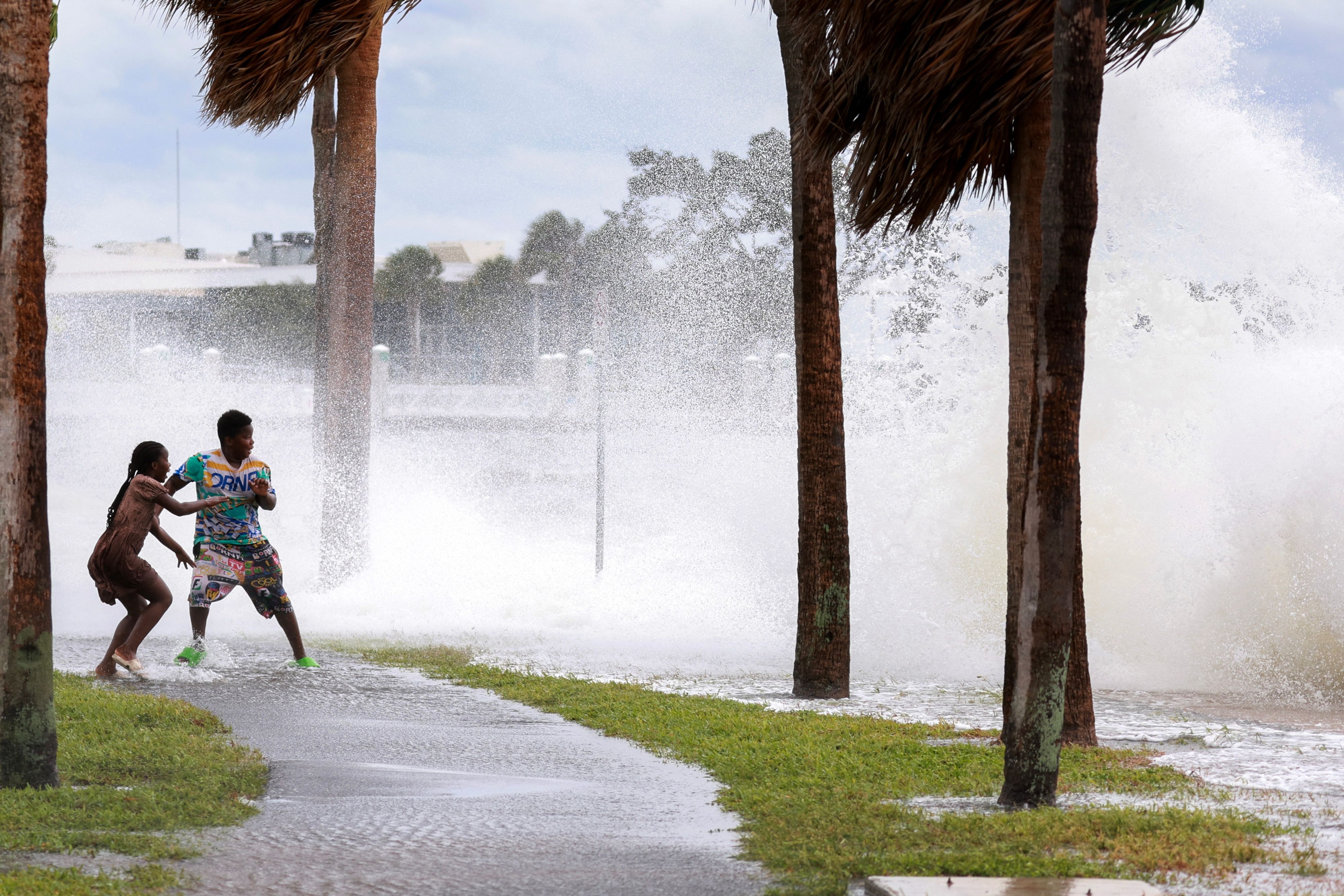 People are splashed by churning surf from Tampa Bay as Hurricane Helene passes offshore on September 26, 2024, in St. Petersburg, Florida. Helene is forecast to become a major hurricane, bringing the potential for deadly storm surges, flooding rain, and destructive hurricane-force winds along parts of the Florida West Coast. (Photo by Joe Raedle/Getty Images)