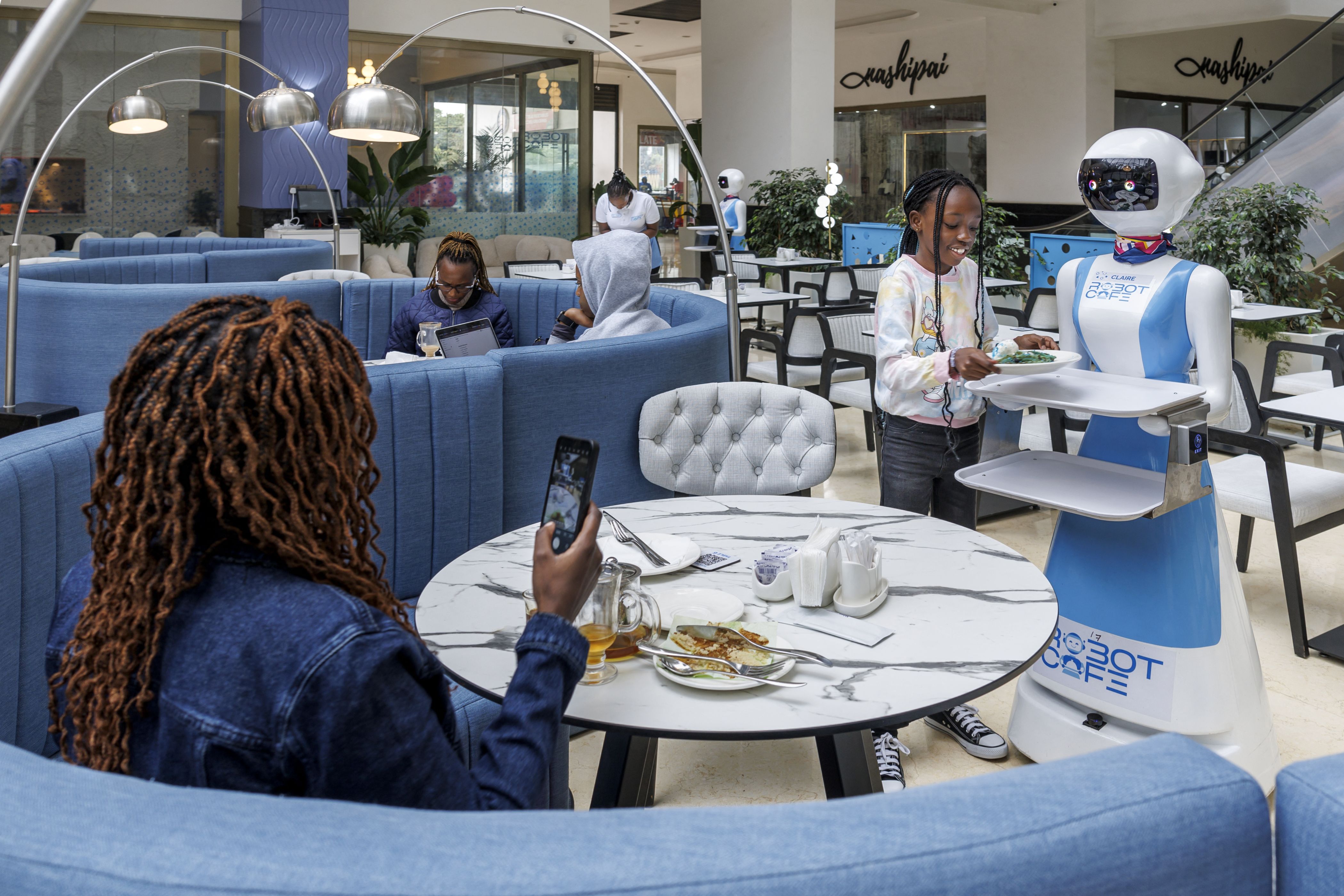 A young patron retreives her meal order from a robotic waiter's tray at the Robot Cafe, Kenya's first restaurant to employ humanoid robots as waiters, in Nairobi on August 27, 2024. Working alongside human staff, the robots are programmed with artificial intelligence and controlled remotely to provide services that include calling out welcomes to approaching patrons, serving up non-spillable orders and even belting out 'happy birthday' music on appropriate occassion. (Photo by Tony Karumba/AFP Photo)