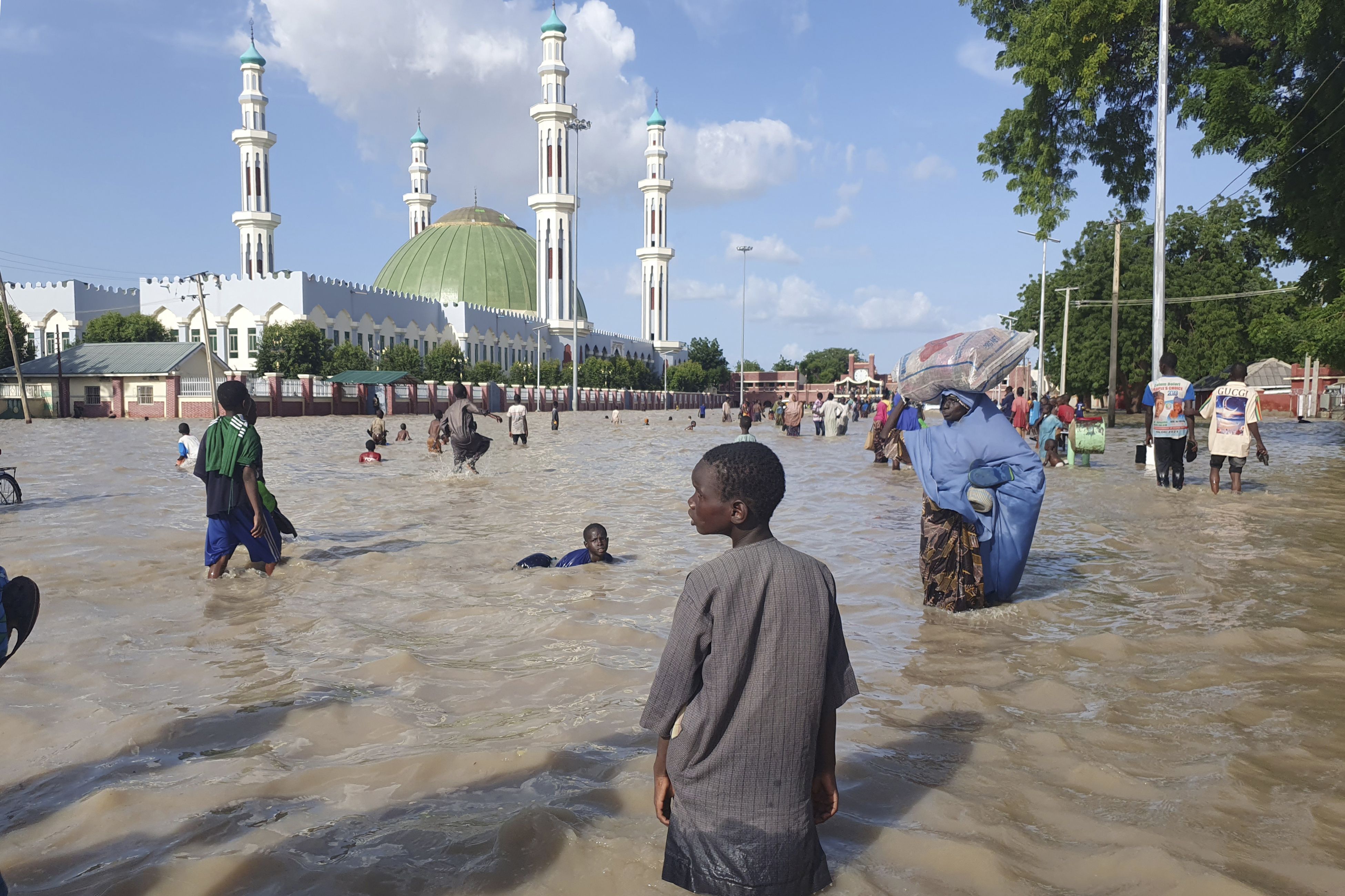 People walk through floodwaters following a dam collapse in Maiduguri, Nigeria, Tuesday September 10, 2024. (Photo by Joshua Olatunji/AP Photos)