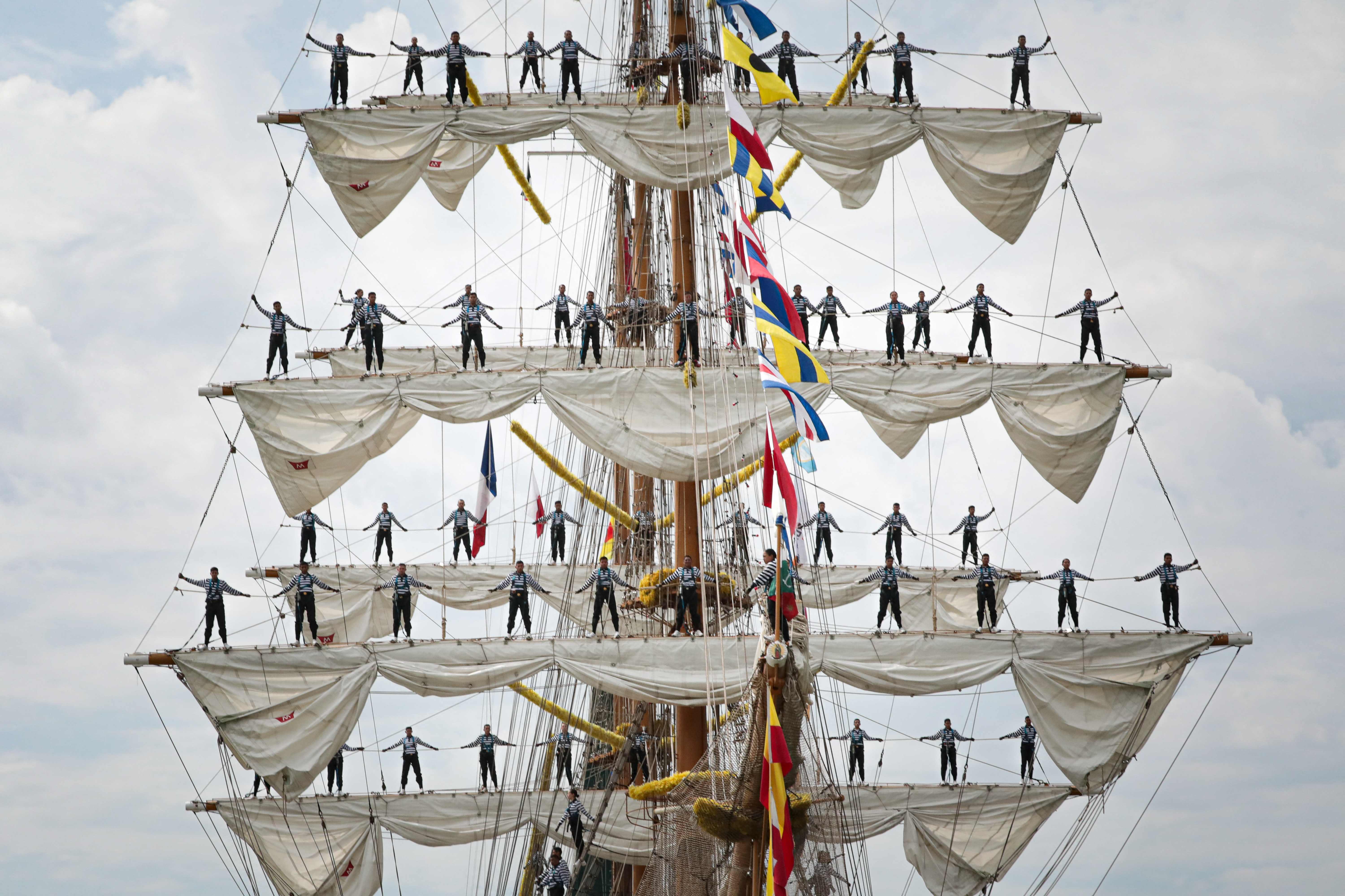 Sailors stand on the sails of the the Cuauhtemoc as the ship leaves Rouen, northwestern France, during the Big parade during the end of the Armada 2023 event, on June 18, 2023. (Photo by Lou Benoist/AFP Photo)