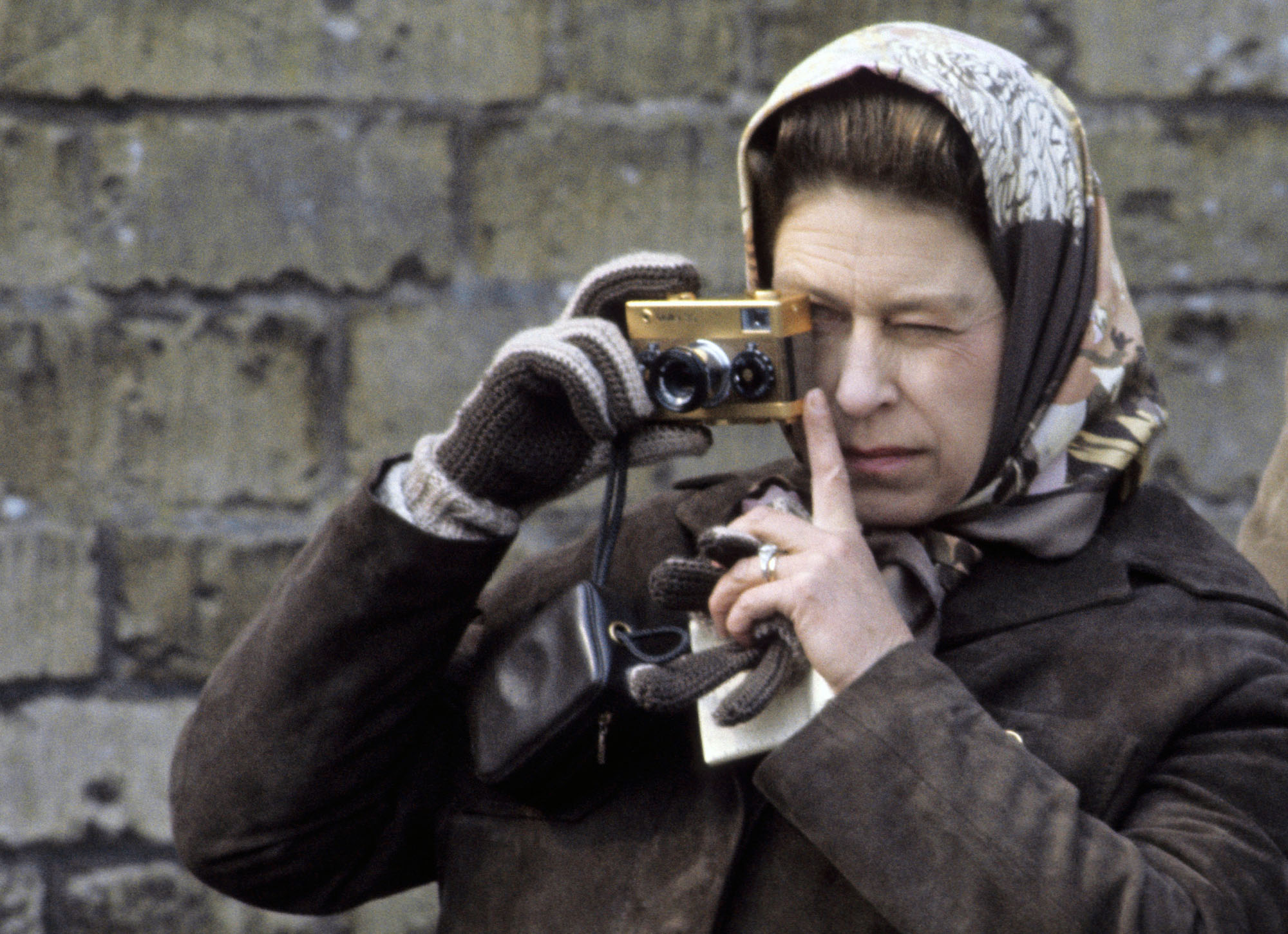 Queen Elizabeth ll takes photographs with her gold Rollei camera during a visit to the Badminton Horse Trials on April 26, 1974 in Badminton, England. (Photo by Anwar Hussein/Getty Images)
